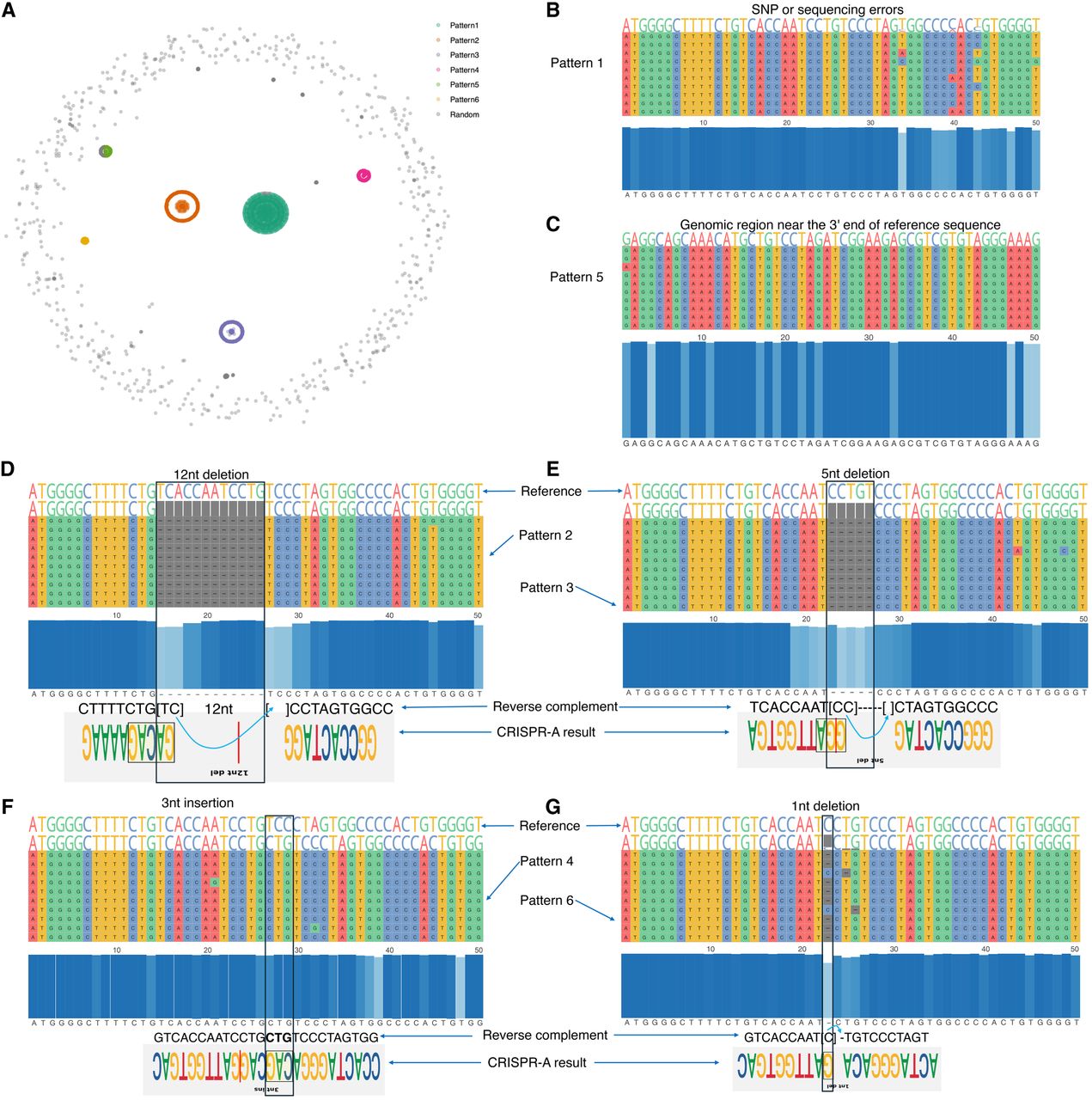 Gene editing patterns. (A) KMAP visualization of aligned DNA sequences. The six clusters are given by DBSCAN based on the 2D embeddings. (B–G) Sequence alignment of each pattern. Each row represents a DNA sequence. Ten sequences from each cluster are shown in the alignment to illustrate the corresponding pattern. The blue panel in the center shows the conservative nucleotide at each position. The top four gene editing patterns given by CRISPR-A are provided at the bottom panel for the last four patterns (D–G), above which are their reverse complements. Note that although the deletions in our result show 1–3 nt shifts compared with CRISPR-A's result, they are equivalent as the shifted nucleotides can be placed on either side of the deletion in the alignment. Pattern 1 is treated as SNPs or sequencing errors by CRISPR-A. Pattern 5 corresponds to a different genomic region.
