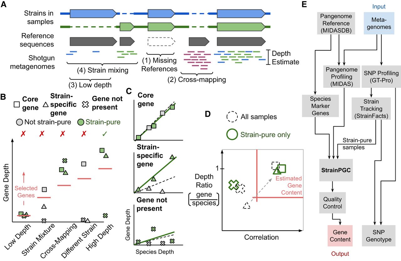 Conceptual overview of strain-resolved gene content reconstruction using StrainPGC. (A) Schematic representation of pangenome profiling, which estimates gene depth based on short-read alignment. The illustration represents profiling of a hypothetical microbial population harboring two strains of the same species (blue and green), each with both shared and strain-specific gene content. Four key challenges for pangenome profiling and gene content estimation are highlighted (brackets; see Introduction). (B) Limitations of gene content estimation using single samples. Depth is shown across five samples for three genes: one gene is ubiquitous across strains (core); another is found in only the strain of interest (strain-specific); and a third is not present in the strain of interest but is susceptible to cross-mapping (not present). Samples are separated along the x-axis and represent five characteristic scenarios: a sample in which the species is not deeply sequenced (low depth), a sample with multiple strains of the species (strain mixture), a sample exhibiting erroneous depth owing to read mapping errors (cross-mapping), a sample with an entirely different strain of the species (different strain), and a high-depth, strain-pure sample (high depth). Colors distinguish between strain-pure samples (green markers) and samples with a different strain or a mixture of more than one strain (gray markers). Traditional, single-sample analysis estimates gene content by selecting genes with a minimum depth (red horizontal line; which is chosen based on the species’ depth). As a result, samples with low depth, cross-mapping, and strain mixing lead to decreased accuracy (indicated with red X's). Only gene content estimation in a strain-pure, high-depth sample without cross-mapping (green checkmark) accurately reflects the strain of interest. (C) Relationship between gene depth and species depth for each of the three genes (panels) across the five samples (marker shape and color as in B). For each, the linear relationship is shown between species depth and gene depth in the set of strain-pure samples (solid green line). We contrast this fit with the linear relationship across all five samples without considering strain variation (dashed line). (D) Schematic depiction of how StrainPGC estimates gene content based on both correlation and depth ratio. The red lines indicate the thresholds of depth ratio and correlation used by StrainPGC to select genes. With all samples combined (dashed markers), the not-present gene is correctly excluded owing to low correlation; the core gene is correctly included, but the strain-specific gene is lost because of its low depth ratio and correlation. Analyzing the strain-pure set separately moves the strain-specific gene into the selection region (dashed arrow), increasing accuracy. (E) Schematic depiction of our integrated workflow to infer gene content across strains using only shotgun metagenomic reads as input.