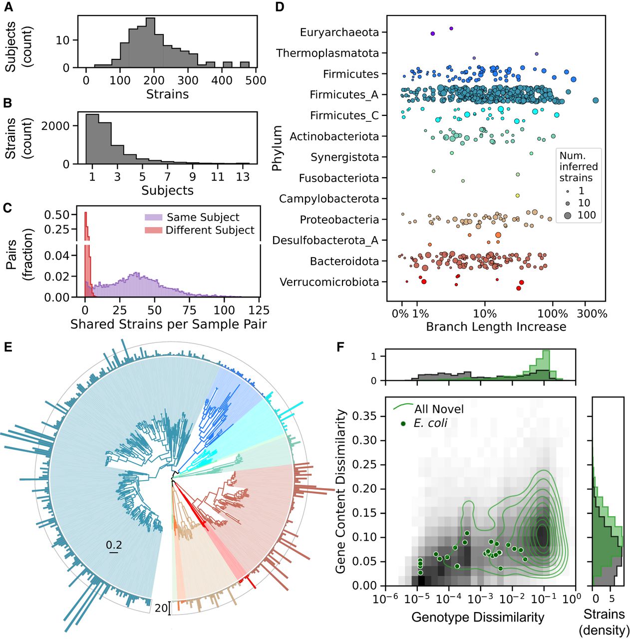 Strain diversity in the HMP2 metagenome collection. (A,B) Histograms reflecting the distribution of inferred strains of any species across subjects in the HMP2 metagenome collection. (A) Number of strains for 106 subjects, summed over all samples (median of 11 samples per subject; IQR: 9–14). Most subjects harbor between 100 and 300 inferred strains (median of 191.5). (B) Number of subjects in which each strain was detected. Only strains found in two or more samples are tallied. Most strains (67%) were found in just one or two subjects. (C) Number of strains shared in any pair of samples from the same (purple) or different (red) subjects. Pairs of samples from different subjects shared a mean of just 0.7 strains. (D) A substantial increase in strain diversity was captured when including inferred strains. Diversity was quantified based on total branch length in a hierarchical clustering (UPGMA) of all SNP genotypes, and the increase was measured as the change in branch length relative to a tree with only reference strains. Points represent individual species and are colored by phylum, and increasing size reflects a larger number of inferred strains. Five species with fewer than three inferred strains had a small decrease in branch length when inferred strains were included; one of these is excluded from the plot, left of the x-axis limit. (E) Taxonomic diversity of 3504 inferred strains of bacteria. The species tree is colored by phylum as in D. Species that had no strains with estimated gene content were omitted, and bars around the outer ring indicate the number of inferred strains (outer ring indicates 20 strains). The branch length scale bar (interior) is in units of substitutions per position. (F) Estimated genotype and gene content dissimilarity from the closest reference genome. Joint (main panel) and marginal distributions (panels above and to the right) are plotted for all high-quality reference (gray background) and inferred (green contours) strains of all species. Gene content dissimilarity of inferred strains is calculated after batch correction (see Methods). Points reflecting each of 28 inferred E. coli strains are also shown. Green contours in the main panel reflect deciles in the 2D kernel density estimator.