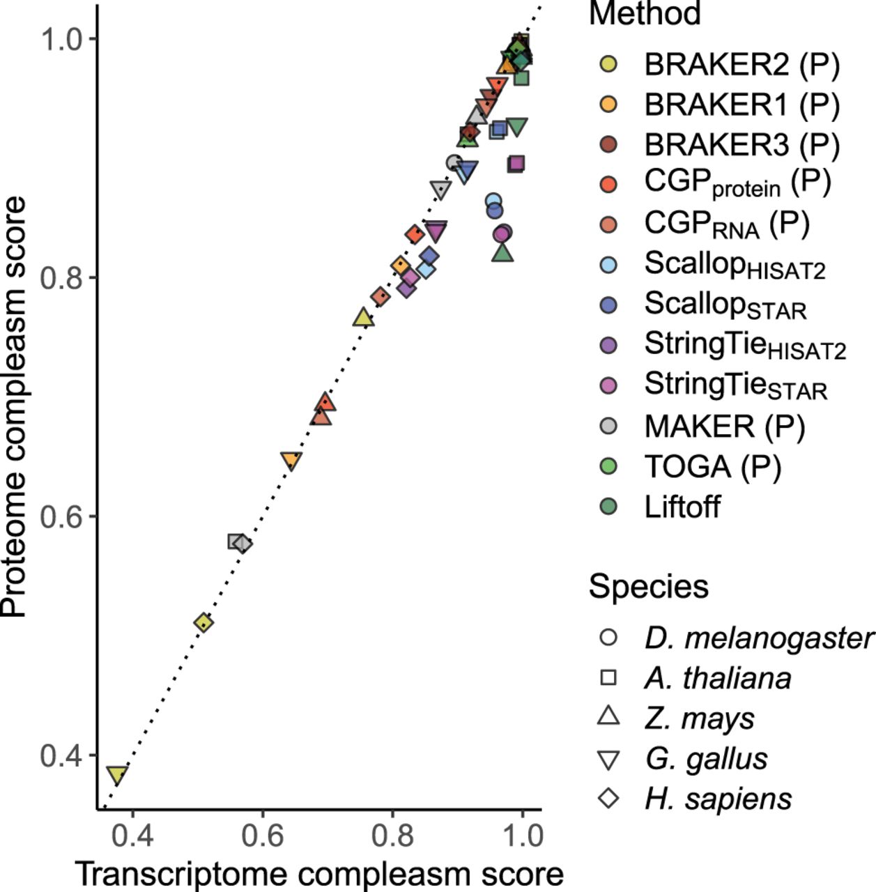 Correlation between proteome and transcriptome compleasm scores for the five reference species. P's in parentheses indicate a method only produces protein-coding predictions.
