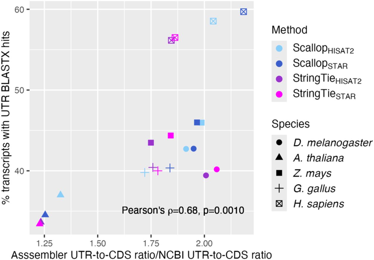 Evidence for undetected CDS in predicted UTR intervals for StringTie + TransDecoder and Scallop + TransDecoder. Increasing percentage of RNA-seq assembler transcripts with UTRs that have a BLASTX hit to the NCBI protein database of the same species, as a function of an increase in the assembler UTR-to-CDS ratio relative to that for NCBI annotations.
