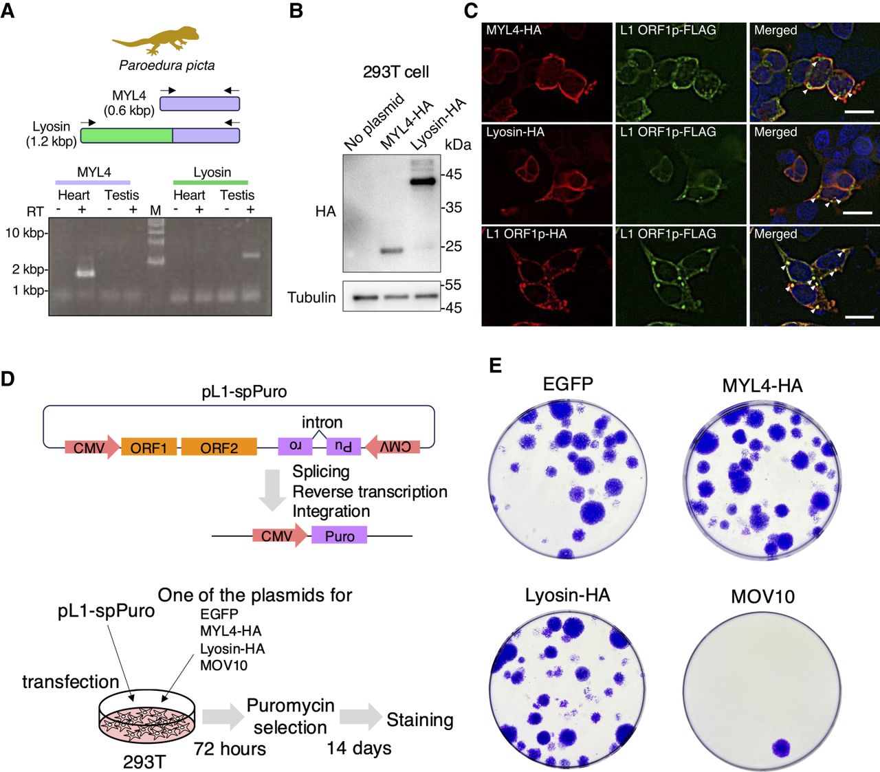 Molecular characterization of the Lyosin protein. (A) RT-PCR targeting the MYL4 and Lyosin transcripts. RNA was extracted from the heart and testis of a sexually matured male Madagascar ground gecko. Samples without reverse transcriptase (RT−) were analyzed as negative controls. (B) Western blotting of MYL4-HA and Lyosin-HA expressed in human 293T cells. (C) Fluorescence immunostaining images in human 293T cells. White arrows indicate L1 ORF1p cytoplasmic foci. The scale bars represent 20 µm. (D) Illustration of the mechanism of L1 retrotransposition assay. (E) Results of L1 retrotransposition assay. The indicated genes and L1 reporter were coexpressed in 293T cells. L1 retrotransposition results in cell colonies resistant to puromycin. MOV10 is used as a positive control that was reported to suppress L1.