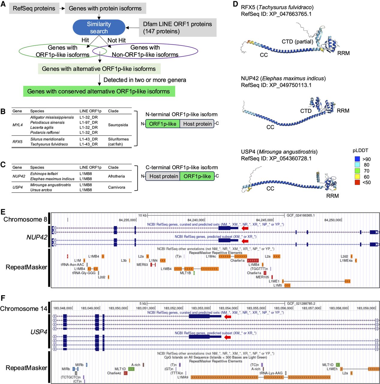 Other ORF1p fusion isoforms in vertebrates. (A) Schematic workflow of the detection of ORF1p fusion isoforms from RefSeq proteins. (B) In the nonmammalian vertebrate RefSeq proteins, two protein-coding genes had alternative ORF1p-like exons. The top hit LINE ORF1p was described in each fusion isoform. In both genes, the amino acid sequences encoded by the first coding exons were similar to ORF1p. (C) In the mammalian vertebrate RefSeq proteins, two protein-coding genes had alternative ORF1p-like exons. The amino acid sequences encoded by the final coding exons were similar to ORF1p. (D) Protein structures of the ORF1p-like amino acid sequence encoded by the noncanonical exons predicted by AlphaFold2. Coiled-coil (CC), RNA recognition motif (RRM), and C-terminal domain (CTD). (E,F) UCSC Genome Browser views of ORF1p-like isoform with RepeatMasker tracks. Red arrows indicate the ORF1p-like exons. The UCSC Genome Browser was accessed on June 25, 2024. NUP42 in the Elephas maximus indicus (Indian elephant) genome assembly (GCF_024166365.1; E), and USP4 in the Mirounga angustirostris (Northern elephant seal) genome assembly (GCF_021288785.2; F).