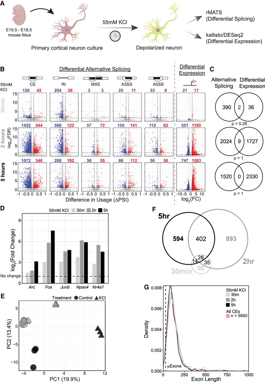KCl induces widespread changes in alternative splicing in mouse primary cortical neurons. (A) General experiment workflow for depolarization of mouse primary neurons using KCl. (B) Volcano plots of global differential splicing and expression changes following KCl treatment in primary cortical neurons from Maze et al. (2015). Differential alternative splicing is presented as change in percentage spliced in (ΔPSI) between KCl-treated and untreated samples for each treatment duration. Expression changes are reported as log2 of the fold change (FC) between equivalent comparisons. Alternative splicing event types analyzed include the following: (CE) cassette exon, (RI) retained intron, (MXE) mutually exclusive exons, (A3SS) alternative 3′ splice site, and (A5SS) alternative 5′ splice site. Splicing events were considered significant with an FDR < 0.05 and |ΔPSI| > 10%. Differentially expressed genes were considered significant with an FDR < 0.05 and |log2FC| > 1.5. Significant differential splicing events and differentially expressed genes are highlighted in red (more included or upregulated) or blue (less included or downregulated). (C) Venn diagrams of overlap between differentially expressed genes and genes containing a differentially spliced event (all event types). Significance of overlap was determined using a hypergeometric test. (D) Differential expression of immediate early genes (IEGs) upon KCl treatment in Maze et al. (2015). (E) Splicing PCA of KCl-treated and untreated primary neurons from Maze et al. (2015). Individual samples are plotted with treatment groups denoted by shape and time point by color. Principal components are calculated using percentage spliced in (PSI) of 21,618 alternative exons (0.1 < PSI < 0.9) quantified at all time points and treatments. (F) Euler plot of genes containing differentially spliced CEs in response to each duration of KCl treatment from Maze et al. (2015). (G) Smoothed density distribution of exon lengths across differentially spliced alternative exons for each duration of KCl treatment in Maze et al. (2015). Pink line denotes CEs (0.1 < PSI < 0.9; n = 9860) regardless of KCl dependence quantified in all samples. Dashed line denotes the upper size limit of μexons (28 nt).