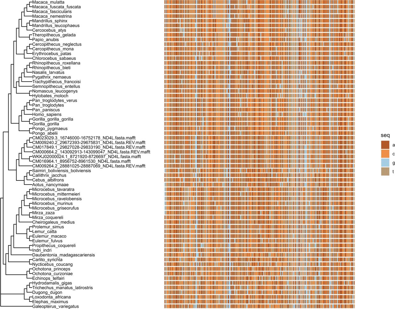Phylogenetic tree and sequences used for codeml analysis of a NUMT cluster that contains dcNUMTs of seven ape species along with mitochondrial sequences of 59 (sub)species. The NUMT gene with an intact reading frame is MT-ND4L. Evolutionary pressures were estimated with codeml using the mitochondrial genetic code. The coding sequence is shown in color using the four-letter-DNA notation illustrating no pinpointed divergence of the NUMT sequences.
