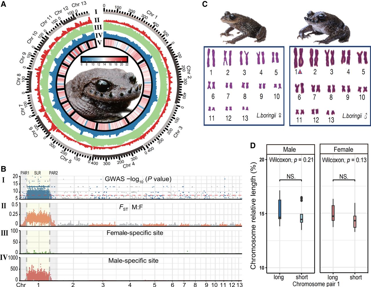 Landscapes of genome assembly (Lbor.v1) and sex chromosomes of L. boringii. (A) Various metrics calculated in 500 kb sliding windows across each chromosome. From outer to inner: (I) sizes of 13 pseudochromosomes; (II) gene density; (III) repeat sequence distribution; (IV) GC content (%); and (V) SNP density (numbers of SNP per window). (B) Sex-linked regions of L. boringii. From top to bottom: (I) –log10 P-values of all the significant sex-associated SNPs; (II) mean FST-value between the sexes; (III) the number of female-specific sites (heterozygous in females and homozygous in males); and (IV) the number of male-specific sites (heterozygous in males and homozygous in females). The red dashed line represents the threshold of GWAS (for statistical details, see Methods), light yellow and gray shadows represent the SLR and two PARs, respectively. (C) Karyotype of female (left and male (right) L. boringii. In the male karyotype (2N = 26), the XY pair (Chr 1) marked with a red triangle shows morphological homomorphy. (D) Box plots show the comparison of Chr 1 relative length in males (blue) and females (red); P-values were based on Wilcoxon rank-sum tests.