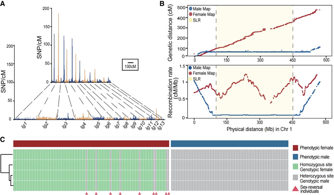 Genetic linkage map and recombination of L. boringii. (A) SNP density along the male (top) and female (bottom) recombination maps. (B) Concordance of physical SNP marker positions on reference genome with the genetic linkage map. The x-axis represents the physical position (Mb) of markers, the y-axis represents the genetic positions (cM) of markers on the linkage map (top) and the recombination rates (bottom); the light yellow region represents the position of the SLR identified from the GWAS result. (C) Sex-reversed individuals of L. boringii. The top row corresponds the phenotypic sex of L. boringii (blue indicates male individuals; red, female individuals), and other rows correspond to results of sex-linked markers: heterozygous in all genotypic males and homozygous in genotypic females. Individuals whose phenotypic and genotypic sex did not match were indicated as sex reversals (red triangles).