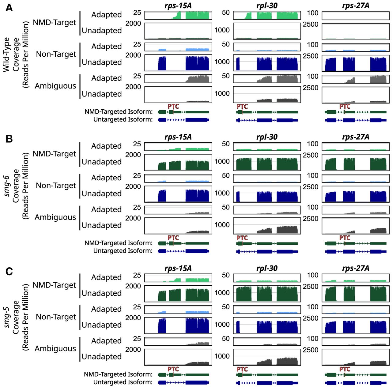 Nanopore degradome sequencing captures smg-6- and smg-5-dependent degradation intermediates on NMD targets. (A) Coverage plots of loci (rps-15A, rpl-30, and rps-27A) in wild-type animals that produce NMD-target and nontarget mRNAs. Read coverage (y-axes) is shown in reads per million. From top to bottom, coverages are for the following categories: adapted NMD isoforms (light green), unadapted NMD isoforms (dark green), adapted non-NMD isoforms (light blue), unadapted non-NMD isoforms (dark blue), adapted ambiguous isoforms (light gray), and unadapted ambiguous isoforms (dark gray). Annotations at the bottom indicate the NMD-targeted isoform and the non-NMD-targeted isoform. (PTC) Location of the NMD-eliciting stop codon. (B) Coverage plots of the indicated loci in smg-6-mutant animals. (C) Coverage plots of the indicated loci in smg-5-mutant animals.
