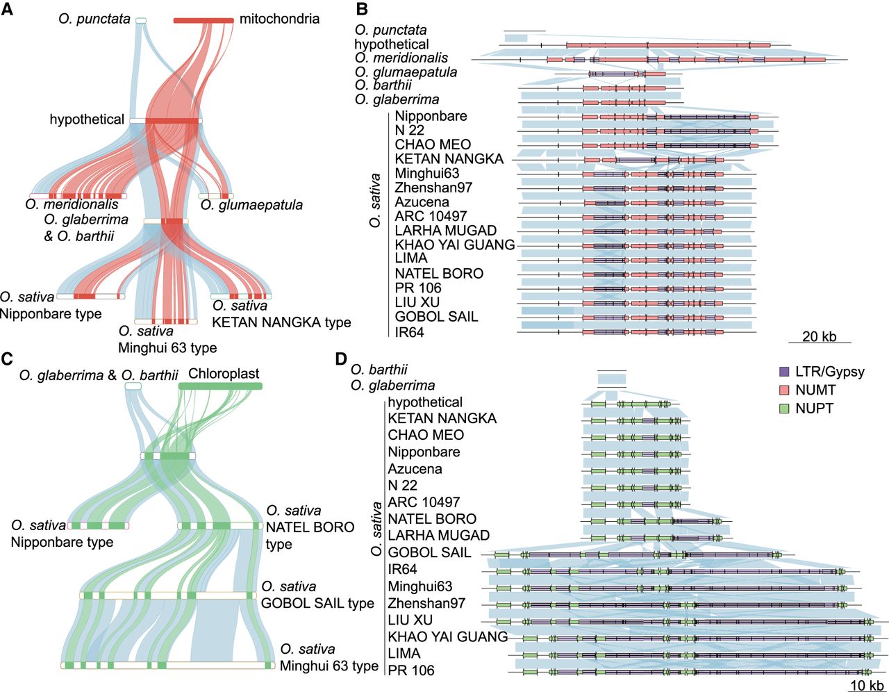 Transposons result in the fragmentation of NORGs. (A) Dynamic process of ONG0400870. The “hypothetical” indicates the insertion form of ONG0400870 in the presumed ancestor of the AA genome, which is inferred from the form of ONG0400870 in the AA genome. The orange color indicates the mtDNA sequence. (B) Synteny of the ONG0400870 region in the O. punctata (BB genome) and AA genomes. The NORG is not present in O. punctata. Orange indicates the NUMT. (C) Dynamics of ONG0400650. The “hypothetical” indicates the insertion form of ONG0400650 in the presumed ancestor of the O. sativa genomes, which is inferred from the form of ONG0400650 in O. sativa. Green color indicates ptDNA sequence. (D) Synteny of the ONG0400650 region in O. barthii, O. glaberrima, and O. sativa. The NORG is not present in O. barthii and O. glaberrima. Green color indicates NUPTs.