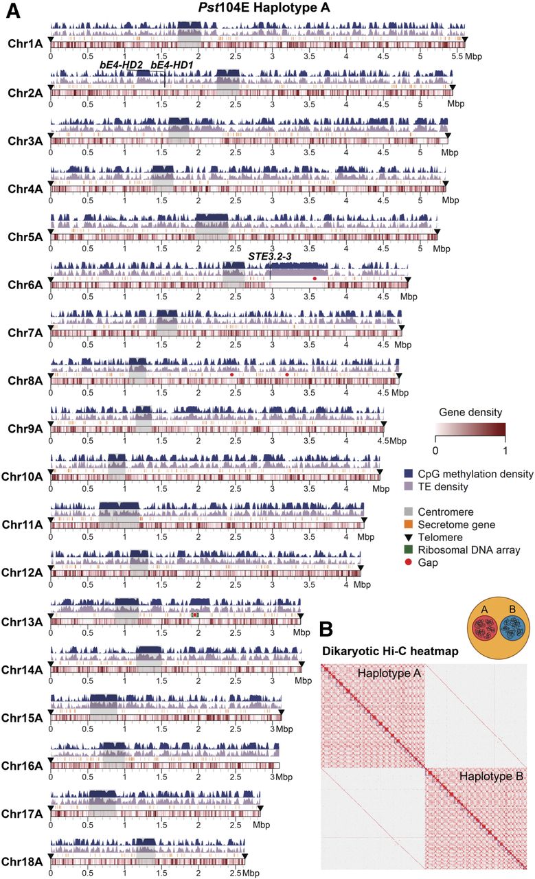 A nuclear-phased, chromosome-scale genome assembly of the dikaryotic fungus Puccinia striiformis f. sp. tritici (Pst) isolate 104E. (A) Karyoplot of the 18 chromosomes of haplotype A, showing CpG methylation and transposable element (TE) density as peaks, and gene density as heatmaps within chromosome ideograms (10 kbp sliding windows). Locations of centromeres, telomeres, secretome genes, the ribosomal DNA (rDNA) array, and assembly gaps are annotated as per the legend. The mating type loci are labeled in black text above the corresponding chromosomes. (B) Hi-C contact heatmap of the full dikaryotic genome assembly consisting of 36 chromosomes. The two nuclear haplotypes A and B display a clear signal of spatial separation.