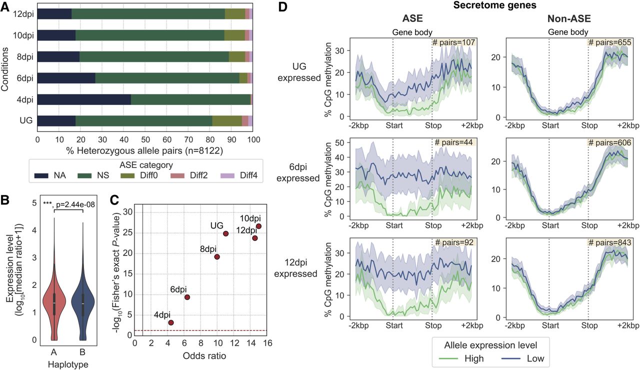 ASE is prevalent among secretome genes and correlates with gene methylation patterns. (A) The five ASE categories detected across six different transcript sampling conditions. Allele pairs displaying absolute log2 fold changes greater than two (Diff2 and Diff4) in at least one condition were defined as ASE in subsequent analysis. (B) Expression levels of alleles belonging to the two nuclear haplotypes A and B. Mann–Whitney U test: (***) P < 0.001. (C) Odds ratios and log10 P-values from Fisher's exact tests comparing the proportion of ASE genes among secretome genes and evolutionarily conserved BUSCOs. Each red dot represents a transcript sampling conditions as labeled. Dotted red and gray lines highlight cut-offs matching the null hypothesis of no difference between the two gene groups. (D) Distribution of the percentage of CpG methylation (sampled at UG) across ASE or non-ASE secretome gene bodies (here defined as start to stop codon) including ±2 kbp flanking regions. Solid lines represent mean percentage of CpG methylation; shaded areas represent 95% bootstrapping confidence intervals. Yellow inset shows the number of allele pairs included.