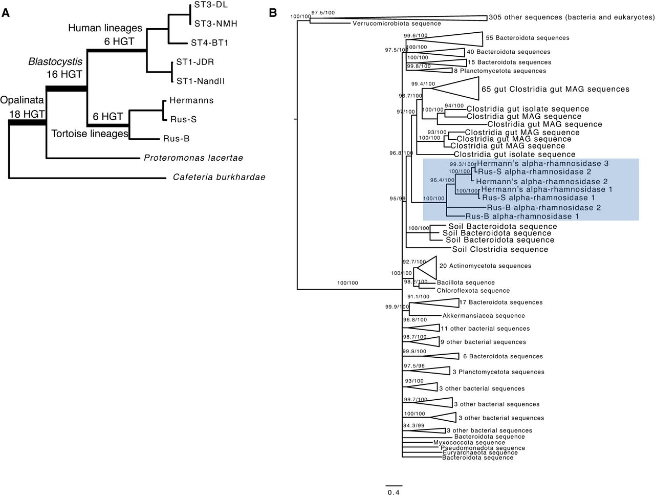 Horizontal gene transfer across Blastocystis evolution. (A) Estimated time of transfer for 40 horizontally transferred genes in Blastocystis shared between more than one species or strain. These data include previously identified and validated cases originally identified in Eme et al. (2017) and newly identified transfer events. (B) Gene phylogeny of tortoise isolate alpha-rhamnosidase genes and 588 homologous proteins. Support values indicate 1000 replicates of SH-aLRT test and ultrafast bootstraps (UFboot). Branches with support values <95 for UFboot or <80 for SH-aLRT are collapsed.