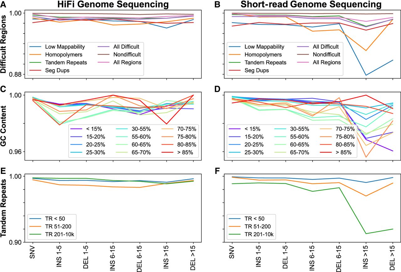 SNV/indel accuracy across GIAB-defined genomic regions. Small variant F1-scores for HiFi genome sequencing (A,C,E) and short-read genome sequencing (B,D,F) across 22 of the 100 interrogated GIAB-defined genomic regions. Results summarized by difficulty (mappability, homopolymers, tandem repeats, segmental duplications, all difficult, not in any difficult, all regions), GC content (<15% to >85%), and tandem repeats (<50 bp, 51–200 bp, 201–10,000 bp), and stratified by variant type (SNV, indels 1–5 bp, 6–15 bp, and ≥16 bp).