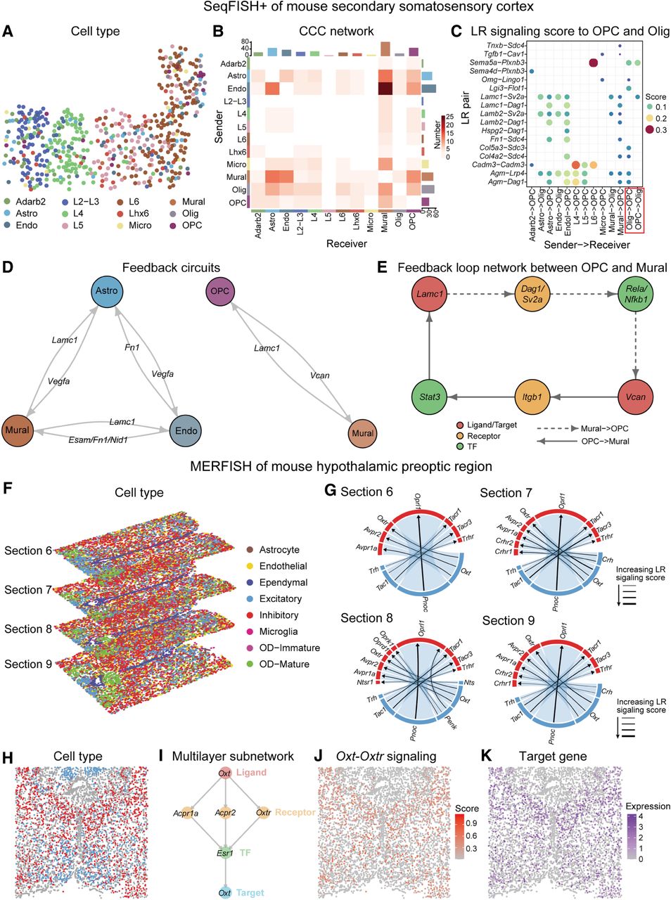 Multilayer signaling analysis of inferred CCC in seqFISH+ data and MERFISH data using stMLnet. (A–E) Multilayer signaling analysis of seqFISH+ of mouse secondary somatosensory cortex. (A) Spatial distribution of different cell types. (Adarb2) Adarb2-iNeruon, (Astro) astrocytes, (L2-L3) L2-L3-eNeuron, (Endo) endothelial, (L4) L4-eNeuron, (L5) L5-eNeuron, (L6) L6-eNeuron, (Lhx6) Lhx6-iNeuron, (Micro) microglia, (Olig) oligodendroglia, and (OPC) oligodendrocyte precursor cells. (B) Heatmap plot of inferred CCC network. “Number” in the plot represents the number of LR pairs between any two cell groups. The top color bar plot represents the sum of column of values displayed in the heatmap. The right color bar plot represents the sum of row of values. (C) Bubble plot of inferred LR signaling activity from other cell types to OPCs and Oligs. Score in the plot denotes the LR signaling activity. (D) The feedback circuits between Astro, Mural, and Endo (left) and the feedback circuits between OPC and Mural (left). Representative ligand/target genes are shown. (E) The feedback loop network between OPC and Mural. Lamc1 (ligand; red) interacts with Dag1/Sv2a (receptor; yellow), whereas Vcan (target gene; red) interacts with Itgb1 (receptor; yellow). Additionally, Lamc1 (target gene; red) is a downstream target from Vcan (ligand; red) via Stat3 (TF; green). Similarly, Vcan is a downstream target from Lamc1 through Rela/Nfkb1 (TF; green). Solid arrows represent signaling from OPC to Mural, and dashed arrows indicate signaling from Mural to OPC. (F–K) Multilayer signaling analysis of MERFISH of mouse hypothalamic preoptic region. (F) Spatial distribution of cell types in multiple tissue slices from MERFISH data. (G) Chord plot of LR signaling activity between excitatory and inhibitory. The links start from a sender cell type (excitatory; blue) and end in a receiver cell type (inhibitory; red) and each line link also connects a ligand–receptor pair. The thickness of the line represents LR signaling score: The thicker the line, the higher corresponding score. (H) Spatial distribution of excitatory and inhibitory in a section 6 slice. (I) Multilayer subnetwork of Oxt-Oxtr. The multilayer signaling subnetwork indicates the regulatory paths from a specific ligand/receptor to its downstream transcriptional factors and then to target genes. (J) The spatial distribution of specific Oxt-Oxtr signaling score. (K) The spatial distribution of target gene (Oxt).