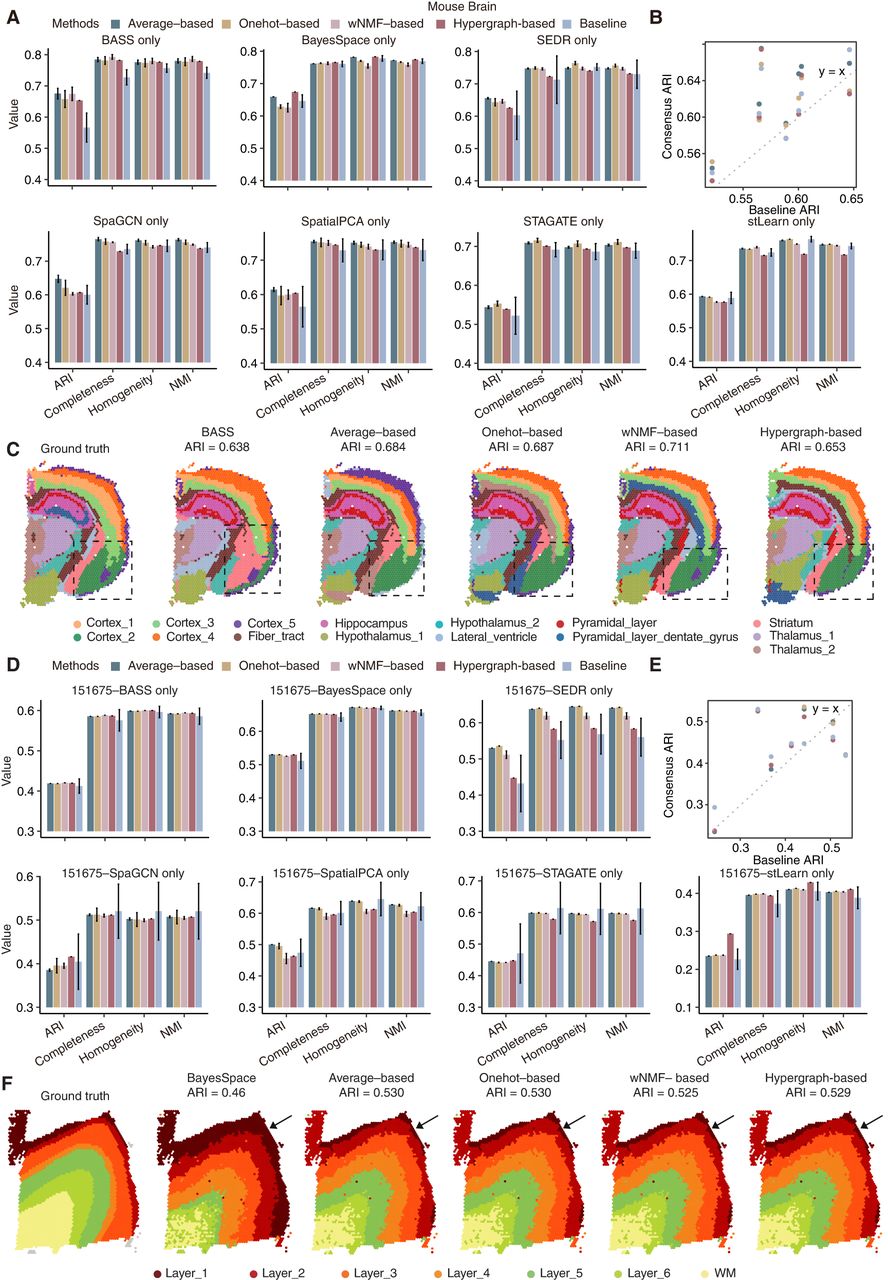 Performance of consensus strategies on single clustering algorithms. (A,D) Consensus clustering accuracies based on single baseline algorithms for the mouse brain data (A) and the DLPFC sample 151675 (D). Each baseline algorithm and consensus strategy are repeated 10 times to calculate the error bars. (B,E) Scatter plot comparing the ARI between baseline methods (x-axis) and consensus strategies (y-axis) for mouse brain data (B) and the DLPFC sample 151675 (E), with the diagonal line indicating equal performance. (C,F) Clustering results of mouse brain and DLPFC sample 151675 by different consensus strategies by using BASS (C) and BayesSpace (F) as baseline algorithms, respectively.