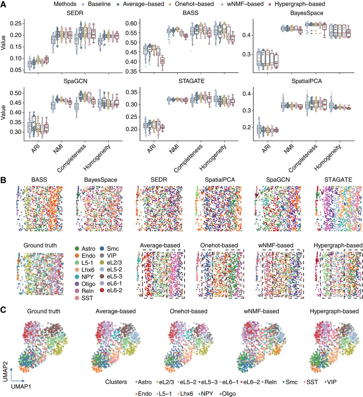 Performance of consensus clustering strategies on the mouse cortex data. (A) Consensus clustering accuracy of the BZ5 sample of the mouse cortex data set based on a single baseline algorithm. Each baseline algorithm and consensus strategy were repeated 10 times. (B) Visualization of clustering results of the baseline algorithm (top) and four consensus strategies (bottom right) on the BZ5 sample of mouse cortex data. (C) UMAP visualization comparing ground-truth cell type labels (leftmost) with clustering results from four consensus strategies.