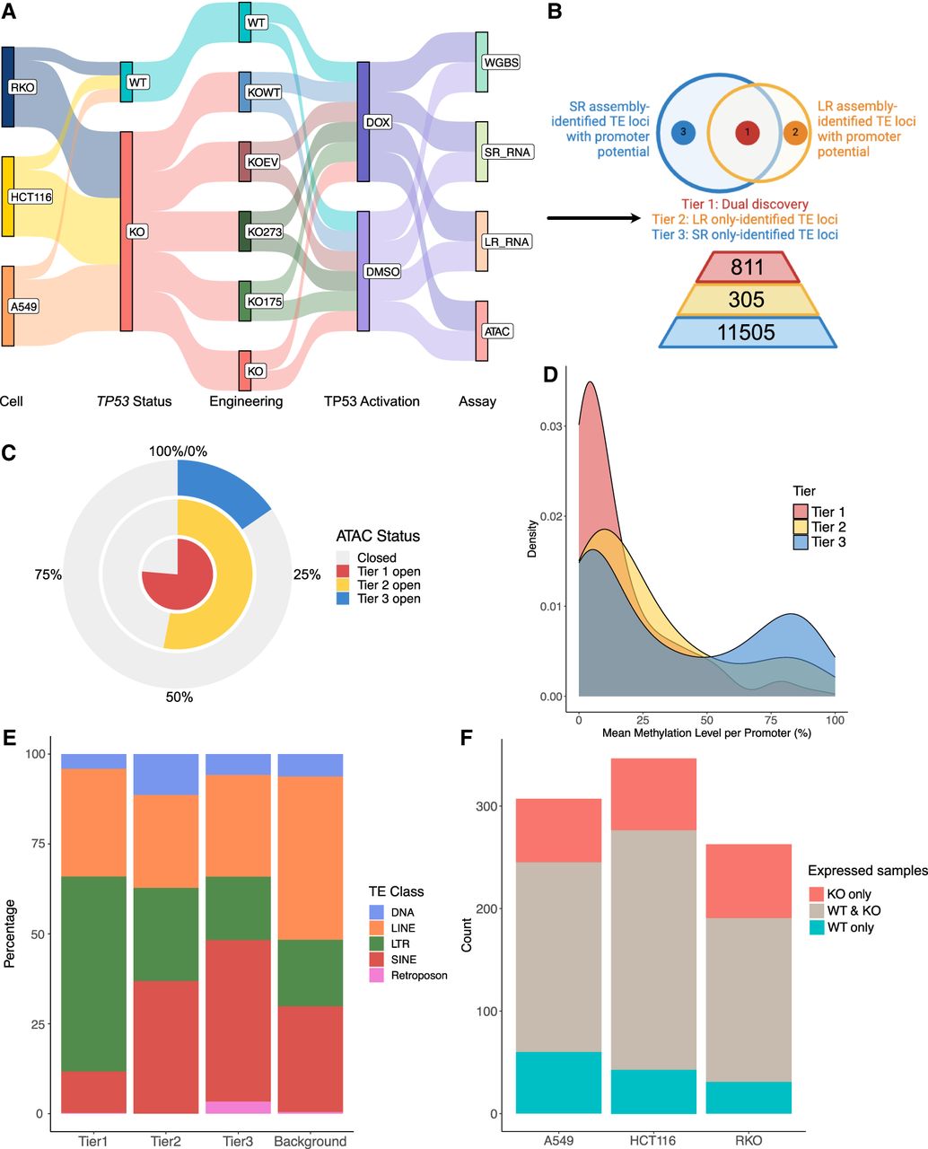 LR-RNA-seq and SR-RNA-seq identify TE loci with promoter potential. (A) Schematics of experiment design. (B) Schematics showing definition and count for three tiers of TE-derived transcripts identified across three cancer cell lines, with or without WT TP53, under DMSO treatment. (C) Percentage of TE-derived promoters (TSS ± 500 bp) that overlap with open chromatin signal from ATAC-seq across three tiers of TE-derived transcripts. (D) Density plot of average DNA methylation level over promoter region (TSS ± 0.5 kb) of TE-derived transcripts across three tiers of TE-derived transcripts. (E) Distribution of the associated TE class of each TE-derived transcript in each tier of identified TE-derived transcripts. (F) Count of TE-derived transcripts with TPM > 1 identified in cells with different TP53 genetic status.