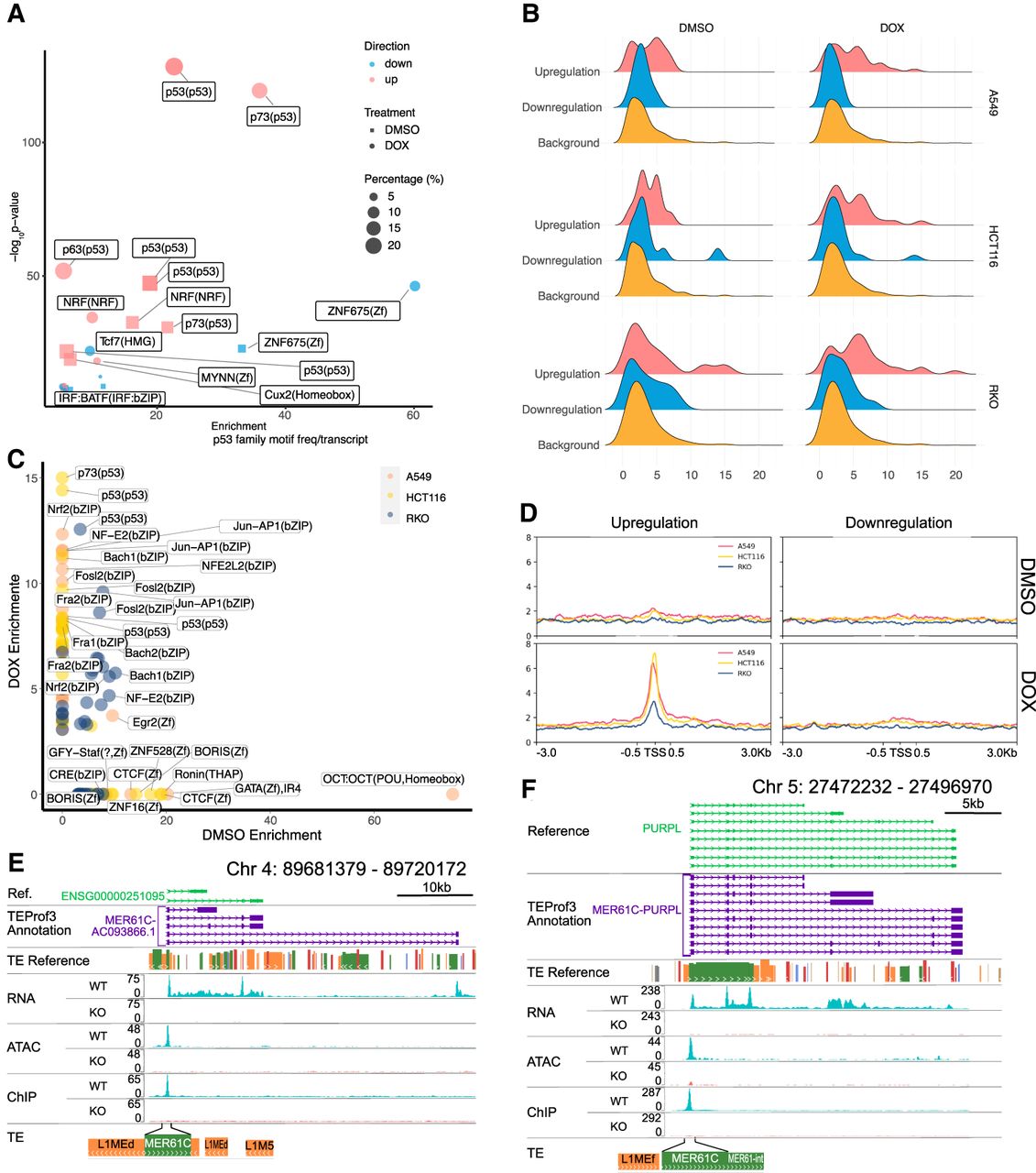 TP53 – TE network is dictated by TP53 binding motifs. (A) HOMER motif enrichment over promoter regions of DETs. WT versus KO DETs from three cell lines were merged together to single sets of transcripts that are either upregulated or downregulated in response to TP53 in either DMSO or doxorubicin (DOX) condition. Pink indicates upregulated DETs and blue indicates downregulated DETs. Square indicates control condition, and circle indicates doxorubicin treatment condition. Size of each shape is proportional to percent presence of this motif in its sample group. Top motif matrices are listed on the right. (B) Density plot of TP53 transcription factor family motif frequency in either upregulated or downregulated transcripts or background TE-derived transcripts that are not differentially expressed. (C) HOMER motif enrichment over open DARs in either control or doxorubicin treatment condition for each cell line. (D) TP53 ChIP-seq occupancy over upregulated or downregulated DET TSS ± 3 kb depicted as average TP53 binding score profile in three cell lines under control and doxorubicin treatment. (E,F) WashU Epigenome Browser of TE-derived transcript MER61C-AC093866.1 in HCT116 (E) and MER61C-PURPL in A549 (F) with bigWig tracks for WT and KO under doxorubicin treatment of SR-RNA-seq, ATAC-seq, and ChIP-seq.