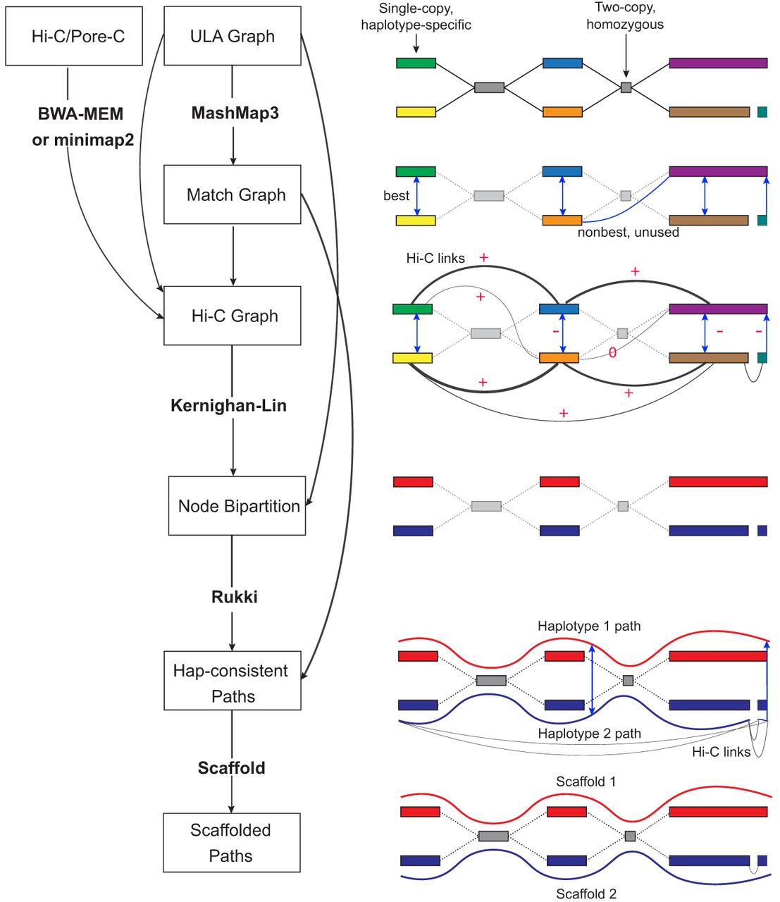 Overview of the Verkko2 Hi-C/Pore-C processing. The process starts with the ULA graph built from the LA and UL sequences. Note that the ULA graph links are only used to cluster the graph into connected components so they are shown as dotted gray lines in the figure. The BWA-MEM/minimap2 step aligns the Hi-C or Pore-C data to the sequences of the ULA graph nodes, and counts connecting pairs of nodes are tallied. Next, the Match Graph step ignores homozygous (based on coverage) and short (by default ≤200 kb) nodes. The remaining nodes are self-aligned to identify homology. The initially computed Hi-C edges are filtered using the Match Graph to build the Hi-C Graph. In many cases, the highest-count Hi-C connection is between homologous pairs of nodes. To avoid these false links, edges connecting potentially repetitive nodes are removed (shown with a value of zero), whereas edges connecting homologous nodes are given large negative weights (shown with −). These updated link weights are used to bipartition each connected component of the graph into two haplotypes. These partitions are then provided to Rukki along with the ULA graph to generate haplotype paths, and the pipeline proceeds as in Verkko1. These haplotype-consistent paths are again used to identify homology, shown with blue edges based on the Match Graph step. All four possible connections are considered to connect the two blue paths based on Hi-C link evidence. In this example, the alignment of both blue paths to the red path adds a multiplicative bonus to one Hi-C connection consistent with the alignment, leading to a scaffold connecting the blue paths.