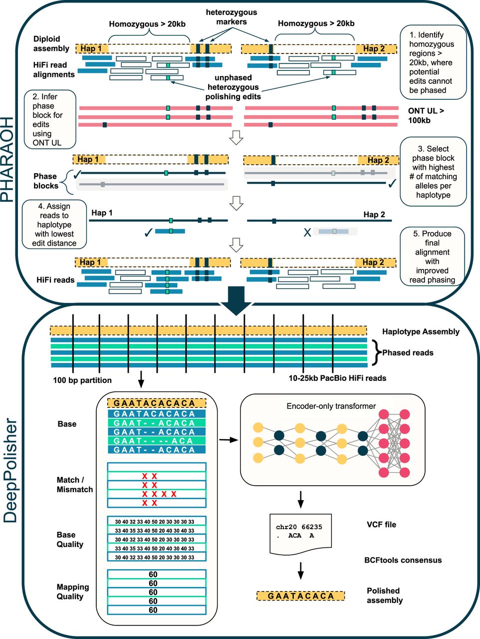 DeepPolisher pipeline overview. The PHARAOH pipeline leverages phase block information from ONT UL reads to correct the haplotype assignment of PacBio HiFi reads. The corrected alignment is passed to DeepPolisher, which is an encoder-only transformer model that predicts the underlying assembly sequence and proposes corrections in VCF format.
