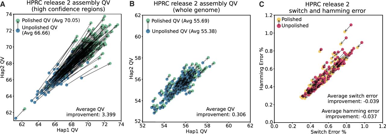 Polishing results for 180 HPRC assemblies. (A) Hap1 QV (x-axis) and Hap2 QV (y-axis) in the high-confidence regions for 180 HPRC samples from the second release. For each sample, unpolished QV is in blue with an arrow pointing to the polished QV. (B) The same as A but for whole-genome QV. (C) Switch (x -axis) and hamming (y-axis) error rate for the 107 samples with trio data. Unpolished in pink with an arrow pointing to polished in yellow.
