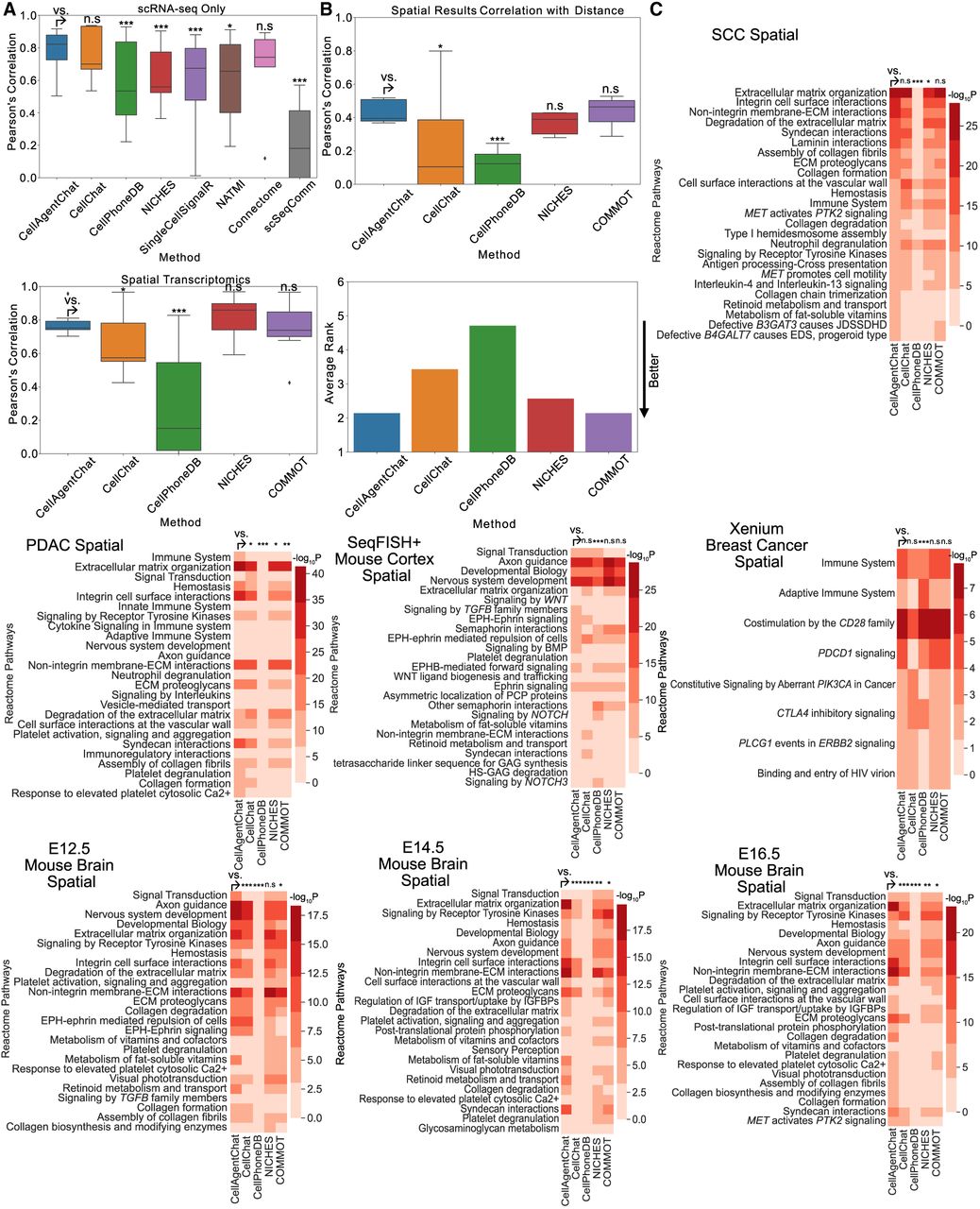 Benchmarking of CellAgentChat with existing state-of-the-art methods. (A) Box plot comparing the Pearson's correlation between inferred cell communication by individual methods and the ensemble of all methods, without (top) and with (bottom) spatial information across all data sets. P-values calculated using Wilcoxon one-sided test: (*) P < 0.05; (**) P < 0.01; (***) P < 0.001. (B) Box plot comparing the Pearson's correlation between the inferred cell communication for each method and the inverse cell-distance matrix (top), across data sets. P-values calculated using Wilcoxon one-sided test: (*) P < 0.05; (**) P < 0.01; (***) P < 0.001. Bottom plot in panel shows the average ranking (lower is better) of each method's correlation across data sets. (C) The Reactome pathway enrichment analysis, performed on ligands and receptors sourced from the top 100 LR pairs inferred by each method across various data sets using spatial transcriptomics data. P-values calculated using Wilcoxon one-sided test: (*) P < 0.05; (**) P < 0.01; (***) P < 0.001.