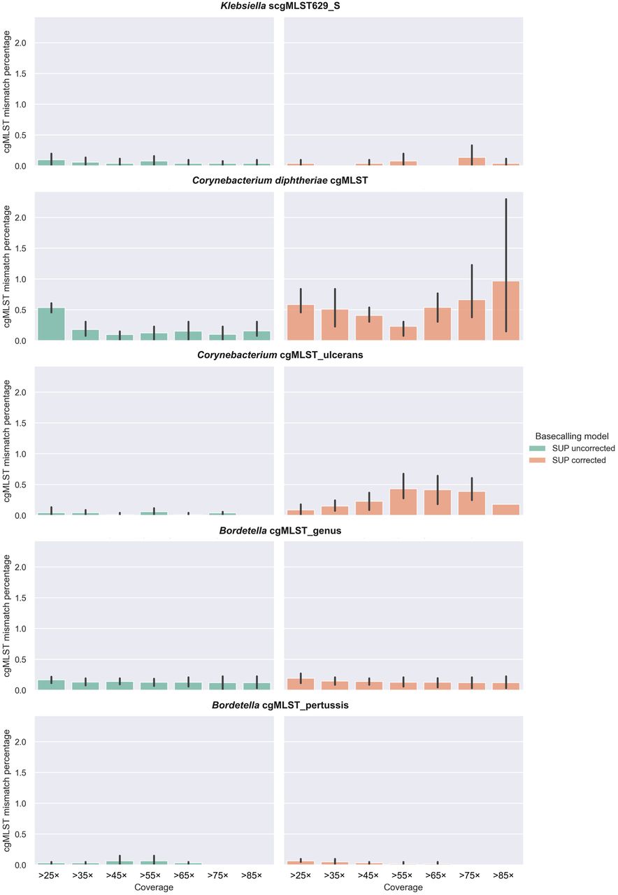 Bar plots showing the percentages of cgMLST allelic mismatches between short-read assemblies generated with Illumina and long-read assemblies generated with Nanopore R10.4.1 sequencing from data basecalled with Dorado SUP v0.9.0. Mismatches are shown at different simulated depths of coverage, which were obtained with a cumulative subsampling strategy. Data on the left represent SUP assemblies without raw read correction (shown in green), whereas data on the right show mismatches for assemblies generated from HERRO-corrected reads (orange). Results for the C. rouxii isolate FRC0190T were excluded from this figure (see Results section).