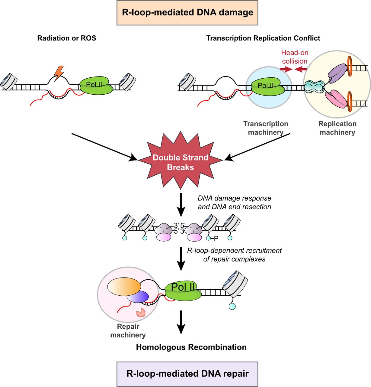 Dual roles of R-loops in DNA damage and repair pathways. The single-strand DNA (ssDNA) in R-loops is susceptible to DNA damage, which can lead to the formation of DNA double-strand breaks (DSBs). Conversely, R-loops also play crucial roles in homologous recombination (HR) repair by facilitating DNA end resection and the recruitment of key repair factors.