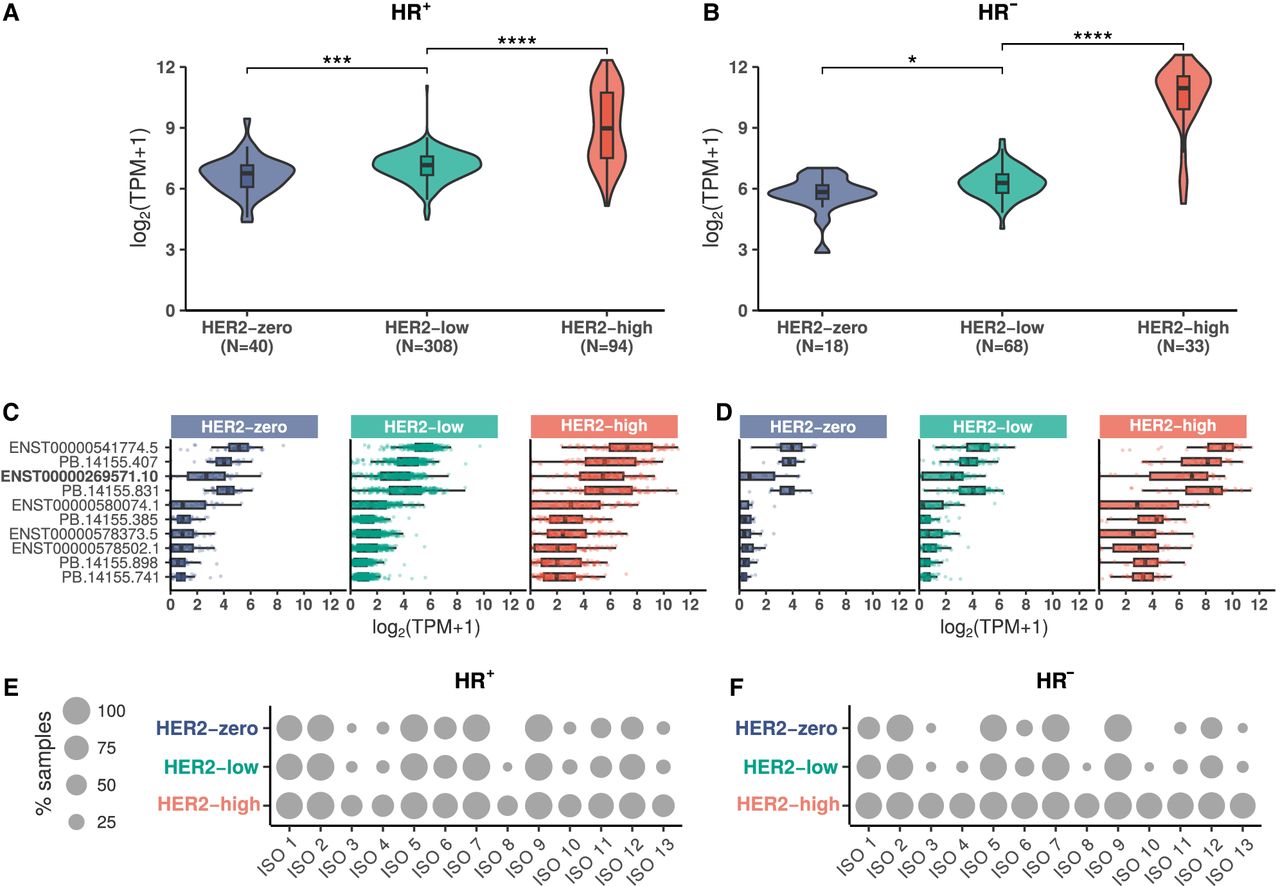 Expression profiles of HER2 gene and splicing isoforms in breast cancer samples classified by immunohistochemistry status of HER2 and hormone receptor. (A,B) HER2 gene expression levels in HR+ (A) and HR− (B) breast cancer samples, stratified by HER2-high (red), HER2-low (green), and HER2-zero (blue) status. Mann–Whitney U test statistical significance: (*) P-value < 0.05, (***) P-value < 0.001, (****) P-value < 0.0001. (C,D) Expression profiles of the top 10 most-expressed HER2 isoforms in HR+ (C) and HR− (D) breast cancer samples, stratified by HER2 status. The canonical HER2 isoform is highlighted in bold. Expression levels are shown in log2(TPM + 1). (E,F) Dot plots showing the percentage of HR+ (E) and HR− (F) TCGA breast cancer samples expressing each HER2 isoform group (ISO 1–13), stratified by HER2 status: zero (blue), low (green), and high (red).