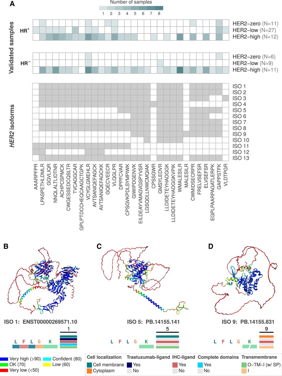 Mass spectrometry (MS) validation of HER2 isoform–derived proteins and their predicted 3D structures. (A) The top panels display the number of samples with MS confirmation of HER2 proteins, stratified by HER2 status (HER2-high, HER2-low, HER2-zero) and hormone receptor status (HR+ and HR−). Isoform-derived proteins are grouped from 1 to 13, and the validated peptides for each group are indicated in the lower panel. (B–D) AlphaFold2-predicted protein structures for HER2 isoforms. (B) The canonical isoform (ISO 1: ENST00000269571) with well-defined domain regions. (C) ISO 5 (PB.14155.141), a variant from group 5 with specific domain alterations affecting its cellular localization and trastuzumab-binding potential. (D) ISO 9 (PB.14155.831), an isoform with unique structural characteristics lacking complete domains, potentially affecting functional properties. Color codes in each structure represent pLDDT confidence scores for structural predictions and the corresponding HER2 protein domains, as the bottom legend indicates. Transmembrane: (O) outside, (TM) transmembrane region, (I) inside, (SP) signal peptide.