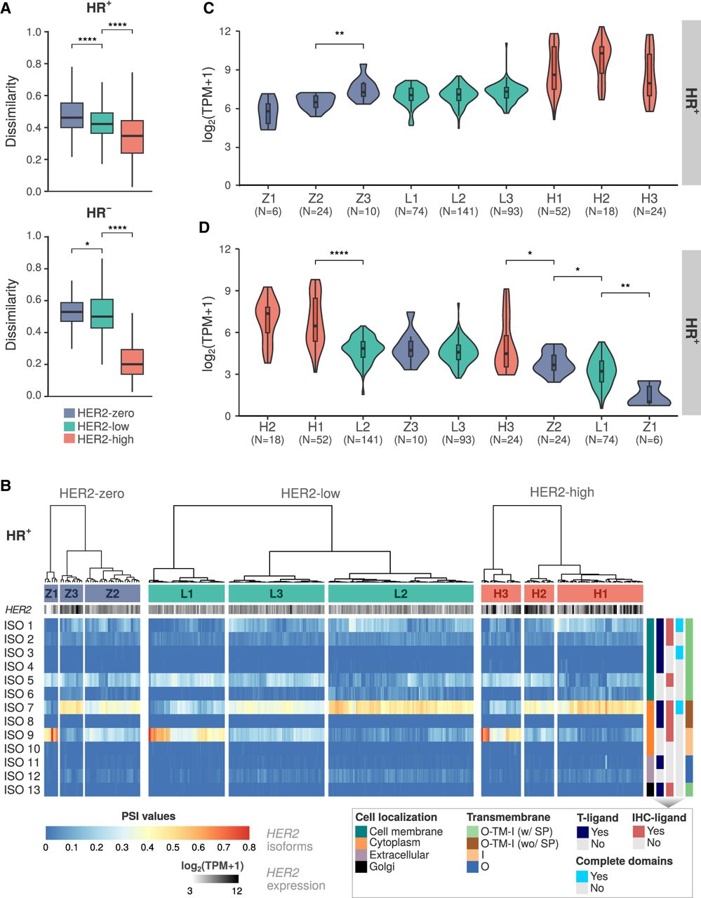 HER2 isoform expression patterns and clustering analysis in HR− and HR+ breast cancer patients stratified by HER2 status. (A) Jaccard index comparing the dissimilarity of HER2 isoform expression between HER2-zero (blue), HER2-low (green), and HER2-high (red) breast cancer samples in HR+ and HR− patients. Mann–Whitney U test significant differences in dissimilarity are noted between HER2 status categories: (*) P-value < 0.05, (****) P-value < 0.0001. (B) Heatmap of HER2 isoform percent spliced in (PSI) levels in HR+ patients, clustered by expression similarity. Z1, Z2, and Z3 are for HER2-zero; L1, L2, and L3 are for HER2-low; H1, H2, and H3 are for HER2-high. Isoform features (cell localization, antibody-binding sites, domain completeness, and transmembrane topology: [O] outside, [TM] transmembrane region, [I] inside, [SP] signal peptide) are indicated on the right. (C) HER2 gene expression levels among HR+ patient clusters. (D) Expression levels of HER2 isoforms whose encoded proteins are located in the cell membrane and contain the trastuzumab-ligand (groups ISO 1–4) among HR+ patient clusters. Mann–Whitney U test statistical significance: (*) P-value < 0.05, (**) P-value < 0.01, (****) P-value < 0.0001. Comparisons without statistical significance are not depicted in the figure.