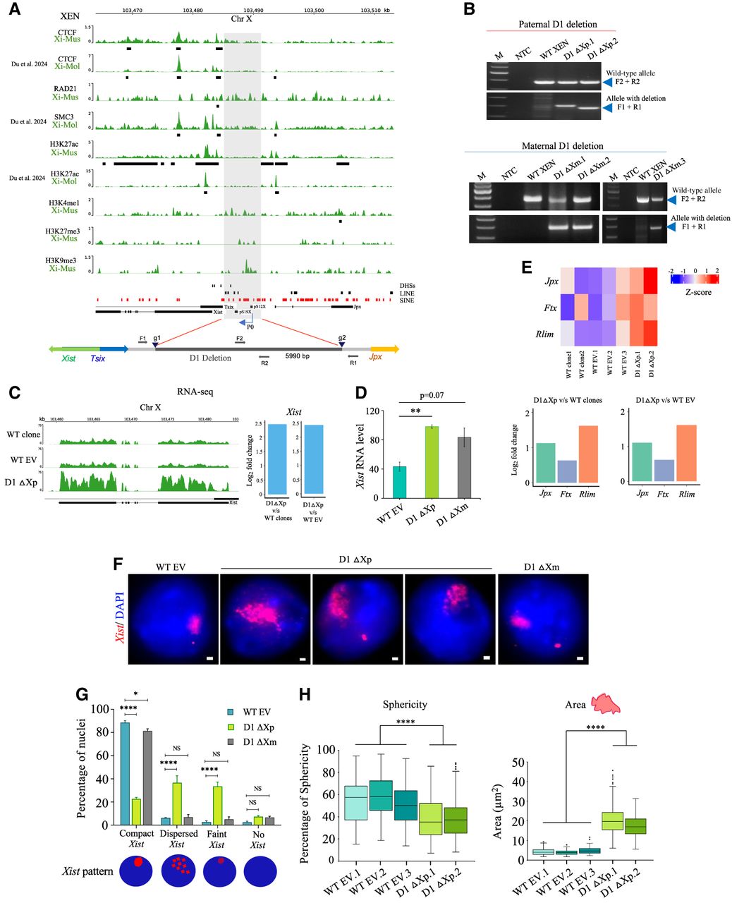 Xist upstream deletion leads to Xist upregulation and Xist dispersal. (A) Top: Plots showing the enrichment of CTCF, RAD21, SMC3, H3K27ac, H3K4me1, H3K27me3, and H3K9me3 at the Xist upstream region targeted for the deletion (shaded) in the Xi of XEN cells. Black boxes denote significant peaks under each track. Enrichment of LINE (black boxes) and SINE (red boxes) elements, DHSs (black boxes) are indicated. Analysis of CTCF XEN (XiMus XaMol), RAD21, H3K27ac, H3K4me1, H3K27me3, and H3K9me3 is based on ChIP-seq. CUT&RUN data of CTCF XEN (XiMol XaMus) and SMC3 XEN obtained from Du et al. (2024). Bottom: Schematic showing the region intermediate to Tsix and Jpx that is targeted for deletion in XEN cells. sgRNA binding sites: g1 and g2. PCR primers F2 and R2, and F1 and R1 shown as gray arrows used for amplification of the wild-type allele and the allele with deletion, respectively. (B) PCR-based identification of clones having the deletion of the Xist upstream region (D1) on the paternal allele (top) and maternal allele (bottom). Arrowheads represent the position of the expected amplicon. Primer pairs used for each deletion are shown on the right. NTC stands for no template control and M for Marker. (C) Left: Genome browser view of Xist expression for WT clones, WT EV, and D1 ΔXp clones as observed through RNA-seq. Right: Bar plots representing the log2 fold change for Xist (>2.4 log2 fold change; FDR ≤0.01) in D1 ΔXp over WT clone and WT EV clones as seen through RNA-seq analysis. (D) Analysis of Xist expression levels by RT-qPCR in WT EV and D1 deleted clones. Tbp is used as the normalizing control. n = 3 biological replicates for each of WT EV and D1 ΔXm and n = 2 for D1 ΔXp was used. Error bars represent the standard error of mean. P values (two-tailed t–test): (**) P ≤ 0.01. (E) Top: Heat map showing the increased expression of Jpx, Ftx, and Rlim in D1 ΔXp cells compared to the WT clone and WT EV clones. Bottom: Plots showing the log2 fold change in expression levels of Jpx, Ftx, Rlim in D1 ΔXp versus WT clone and WT EV clones as quantified through RNA-seq. (F) RNA-FISH using double-stranded DNA probe for Xist/Tsix-Cy3 (red) in wild-type empty-vector transfected (WT EV) and heterozygous clones of both paternally (D1 ΔXp) and maternally (D1 ΔXm) deleted clones. DAPI (blue) counterstains the nucleus. Scale bars: 1 µm. (G) Plot representing the quantification of the Xist RNA-FISH signals in WT EV and heterozygous (D1 ΔXp and D1 ΔXm) clones. Bottom: Schematic representing different types of Xist pattern. n = 3 biological replicates in each of WT EV and D1 ΔXm and n = 2 for D1 ΔXp. P values (two-way ANOVA): (****) P ≤ 0.0001, (*) P ≤ 0.05 and NS implies nonsignificant. (H) Box plots representing the quantification of sphericity and the area occupied by Xist clouds in WT EV clones and clones with paternal D1 deletion. P values (Mann–Whitney U test): (****) P ≤ 0.0001. n = 113, 100, 110, 100, 103.