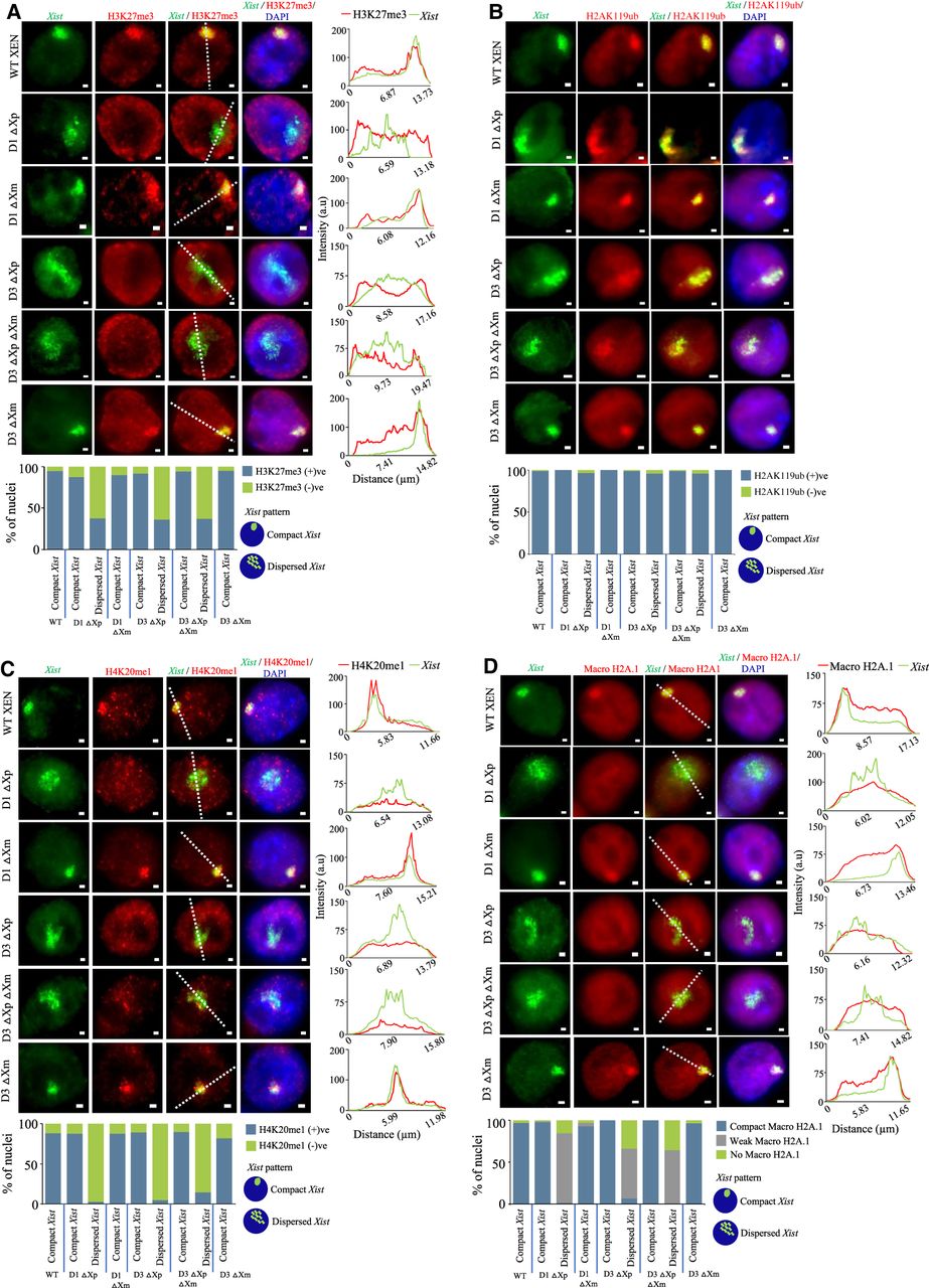 Xist dispersal is associated with the loss of enrichment of repressive chromatin marks on the inactive X. (A) Representative images of IF-RNA FISH of H3K27me3 (red) and Xist (green) for WT XEN, D1 ΔXp, D1 ΔXm, D3 ΔXp, D3 ΔXp ΔXm, and D3 ΔXm lines. Right: Corresponding fluorescent intensity profiles for Xist and H3K27me3 along the white line drawn across the Xist cloud. Bottom: Quantification of the enrichment of H3K27me3 on the inactive X in compact and dispersed Xist nuclei. n = 129, 108, 66, 96, 112, 105, 132, 100, 145 (for each data point from left to right). (B) Representative IF-RNA FISH images for H2AK119ub (red) and Xist (green) for D1 and D3 deleted lines. Bottom: Quantification of the the enrichment of H2AK119ub on the inactive X in compact and dispersed Xist nuclei. n = 120, 123, 128, 126, 108, 146, 135, 127, 116 (for each data point from left to right). (C) IF-RNA FISH images with corresponding intensity profiles for H4K20me1 (red) and Xist (green). Bottom: Quantification for enrichment of H4K20me1 in compact and dispersed Xist nuclei. n = 137, 153, 135, 155, 131, 141, 133, 129, 143 (for each data point from left to right). (D) Macro H2A.1 (red) and Xist (green) IF-RNA FISH representative images with their corresponding intensity profiles are shown. Bottom: Quantification of compact, weak, and no Macro H2A.1 signals in nuclei having compact and dispersed Xist clouds in the D1 and D3 deleted lines. n = 120, 158, 137, 138, 116, 106, 110, 109, 135 (for each data point from left to right). A single-stranded RNA probe was used to detect Xist.