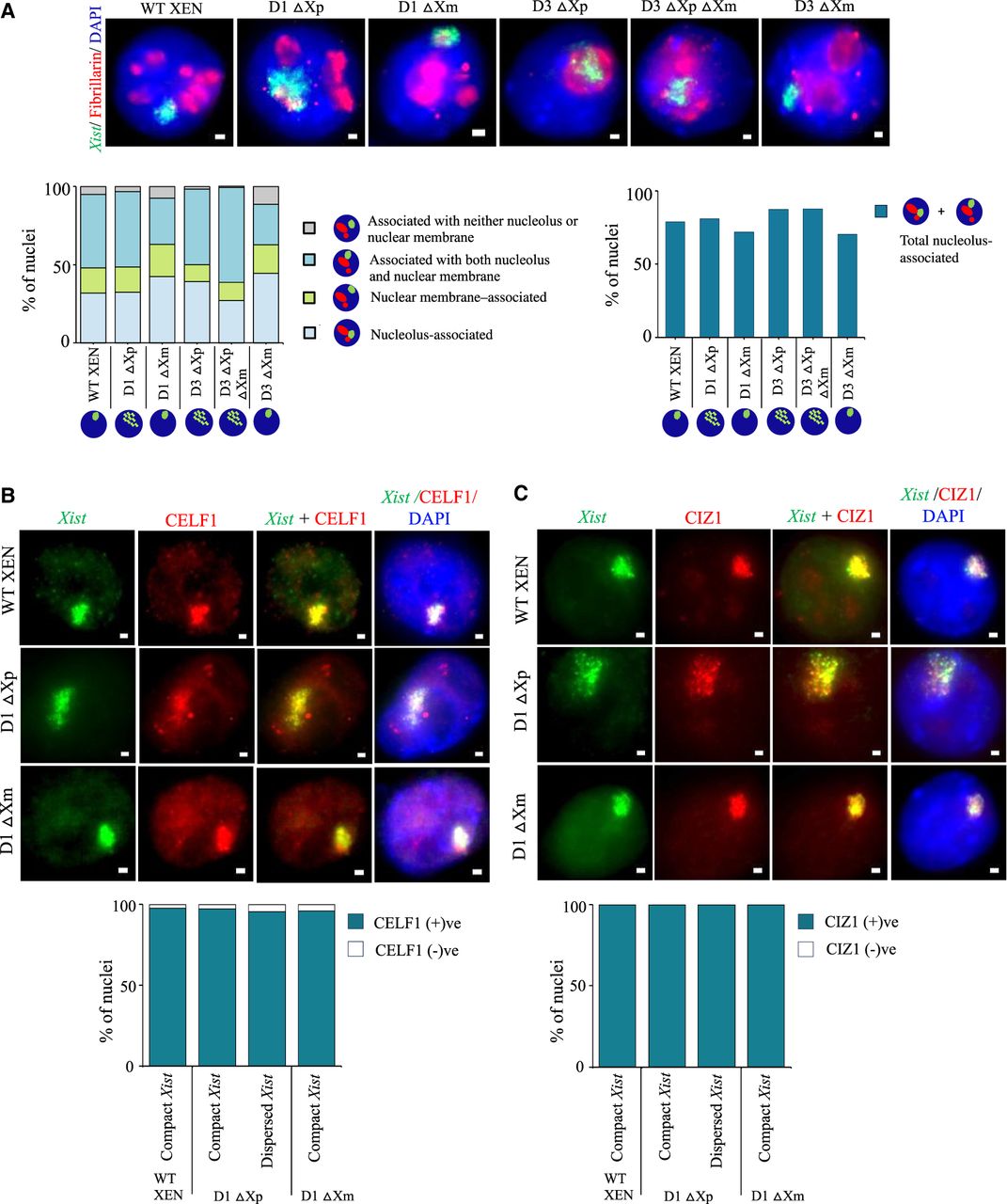 Xist-dispersed nuclei retains association with the nucleolus and do not show alteration in CELF1 and CIZ1 enrichment. (A) Top: Representative images of IF-RNA FISH for fibrillarin (red) and Xist (green) in WT, D1, and D3 deleted lines. Bottom:Quantification of the association between Xist cloud and fibrillarin signals in nuclei with compact and dispersed Xist clouds in the D1 and D3 deleted lines. n = 119, 157, 146, 120, 122, 148 (for each data point from left to right). Quantifications were performed based on single Z-planes. (B) Representative images for IF-RNA- FISH for CELF1(red) and Xist (green) in WT and D1 deleted lines. Bottom: Quantification of enrichment of CELF1 on the inactive X in compact versus dispersed Xist nuclei. n = 246, 110, 96, 101 (for each data point from left to right). (C) Images representing IF-RNA-FISH for CIZ1 (red) and Xist (green) in WT and D1 deleted lines. Bottom: Quantification of enrichment of CIZ1 on the inactive X in compact versus dispersed Xist nuclei. n = 128, 111, 120, 114 (for each data point from left to right). A single-stranded RNA probe was used to detect Xist.