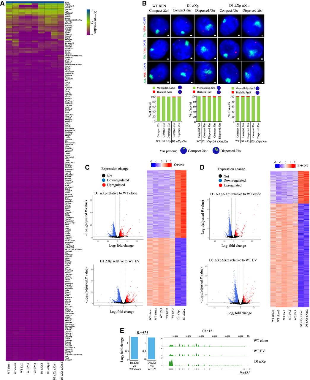 Xist upstream deletion affects autosomal gene expression. (A) Heat map showing the fraction allelic expression pattern of different X-linked genes for D1 ΔXp.1, D1 ΔXp.2, D3 ΔXpΔXm.1, and D3 ΔXp ΔXm.2 lines as compared to WT clones and WT EV clones (WT EV.1, WT EV.2, and WT EV.3). (B) Representative images of RNA-FISH for Xist (green) and X-linked genes Rlim, Atrx, and Pgk1 (red) in WT and D1 and D3 deletion lines. Bottom: Quantification of mono/biallelic expression of Rlim (n = 109, 109, 86, 116, 126), Atrx (n = 103, 85, 101, 159, 136), or Pgk1(n = 117, 118, 102, 120, 88) in nuclei having compact versus dispersed Xist clouds. A single-stranded RNA probe was used to detect Xist. (C) Left: Volcano plots representing the differentially expressed genes in D1 ΔXp relative to WT clones and WT EV clones (DESeq2: log2 FC > 2; FDR < 0.01). Right: Heat map showing the top differentially expressed genes in D1 ΔXp relative to WT clones and WT EV clones. (D) Left: Volcano plots representing the differentially expressed genes in D3 ΔXpΔXm relative to WT clones and WT EV clones (DESeq2: log2 FC > 2; FDR <0.01). Right: Heat map showing the differentially expressed genes in D3 ΔXpΔXm relative to WT clones and WT EV clones. (E) Left: Plots showing fold changes of Rad21 expression as seen through RNA-seq for D1 ΔXp lines as compared to WT clones and WT EV clones. Right: Genome browser views showing Rad21 expression across the genomic loci for WT clone, WT EV, and D1 ΔXp lines.