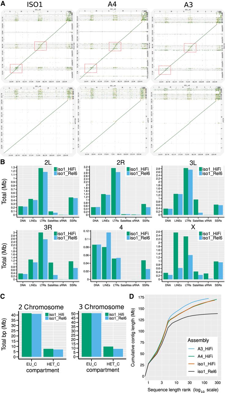 Comparison of assemblies here to that of Release 6. (A) D-Genies dot plots of the Release 6 reference genome assembly scaffolds for Drosophila melanogaster (x-axis) versus our contig- (top) and scaffold-level (bottom) assemblies of iso-1, A4, and A3. (B) Repeat content comparison of iso-1 Release 6 assembly versus our iso-1 HiFi assembly for each Muller element (i.e., autosomal chromosome arms and the X Chromosome). (C) Comparison of total sequence assigned to euchromatic and heterochromatic compartments in iso-1 Rel6 versus iso-1 HiFi for 2 and 3 Chromosomes. (D) Cumulative length plot for assembly contigs of strains used in this study and iso-1 Release 6. The x-axis is on a log10 scale.