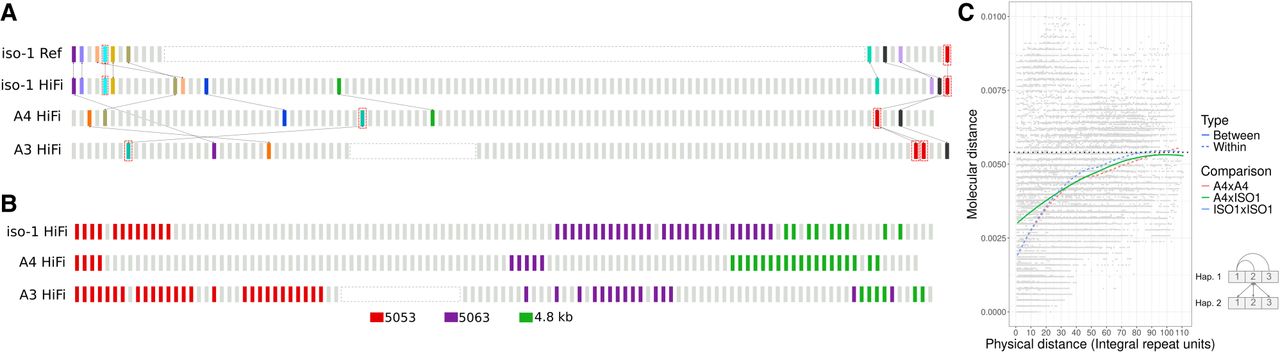The histone locus is a dynamic array characterized by extensive rearrangements across different D. melanogaster haplotypes. (A) Distribution of landmark anchors used in this study. Anchors enclosed in red boxes indicate units harboring TE insertions. Other anchors are identified by phylogenetic grouping (see Methods). Anchors sharing the same color are putatively homologous. Lines between strains highlight the positions of these putative homologs in their respective haplotypes. (B) Distribution of unit types along the histone cluster in three haplotypes, including two additional subtypes of 5-kb: 5053 and 5063. (C) Graphical representation of physical distance between histone units on the chromosome (x-axis) and molecular distance (y-axis). Molecular distances represent all unique pairwise comparisons either between or within strains. Bottom right: Schematic diagram how molecular distance comparisons between and within strain comparisons were conducted.