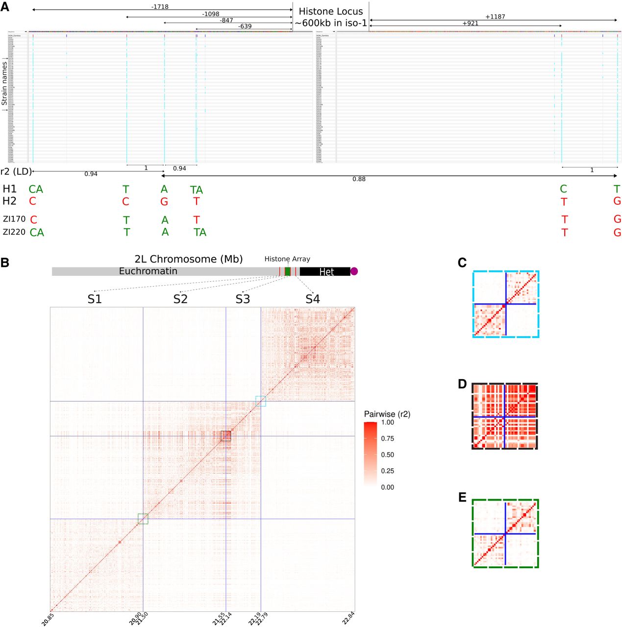 Recombination (crossing-over) in and around the histone locus. (A) Integrative Genomics Viewer plot of the regions flanking the histone locus. Values between double-headed arrows under the x-axis indicate the r2 measure of linkage disequilibrium between the variants spanned by the arrows. Coordinates are with respect to the histone locus, with negative values indicating the distal flank and positive values indicating the proximal flank. H1 and H2 each represent haplotypes present in all but two strains. ZI170 and ZI220 possess their own private combinations of variants from H1 and H2 haplotypes and are the only representatives of their respective haplotypes. (B) Matrix of r2 between 4- and 50-kb segments (S1–S4) around the histone locus. Each segment is fixed in physical size. Because only variants are plotted, the plotted size scales with the number of variants in the segment. Each segment is separated by a size determined by the length of the histone cluster in iso-1 (∼600 kb). Colored boxes correspond to expansions in panels C–E. Bottom: Schematic representation of Chromosome 2L and the location of the histone locus with respect to the segments and to the annotated boundaries of the heterochromatin. (C) Expanded view of pairwise LD for 50-kb regions flanking a control locus spanning 22.19–22.79 Mb (i.e., S3 and S4). (D) Expanded view of pairwise LD for 50-kb regions flanking the histone locus spanning 21.55–22.14 Mb (i.e., S2 and S2). (E) Expanded view of pairwise LD for 50-kb regions flanking a control locus spanning 20.9–21.5 Mb (i.e., S1 and S2).