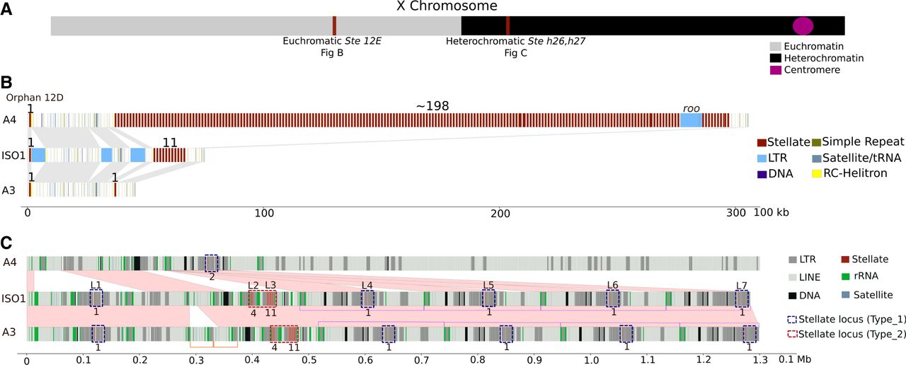 Maps and structural comparison of the euchromatic and heterochromatic Stellate gene clusters. (A) Schematic illustration of the location of the Stellate clusters relative to the rest of the X Chromosome. (B) Overview of the structure of the euchromatic Stellate locus. The numbers on the top represent full-length Stellate sequences in the tandem array. (C) Overview of the structure of the heterochromatic Stellate locus. Type_1 and Type_2 loci are marked by labels on the top in iso-1. The numbers on the bottom represent full-length Stellate sequences in the particular locus. The light pink color parallelograms represent syntenic sequences (drawn by eye). Purple half-rectangles represent the ∼200-kb tandem segmental duplicates harboring some of Type_1 loci.