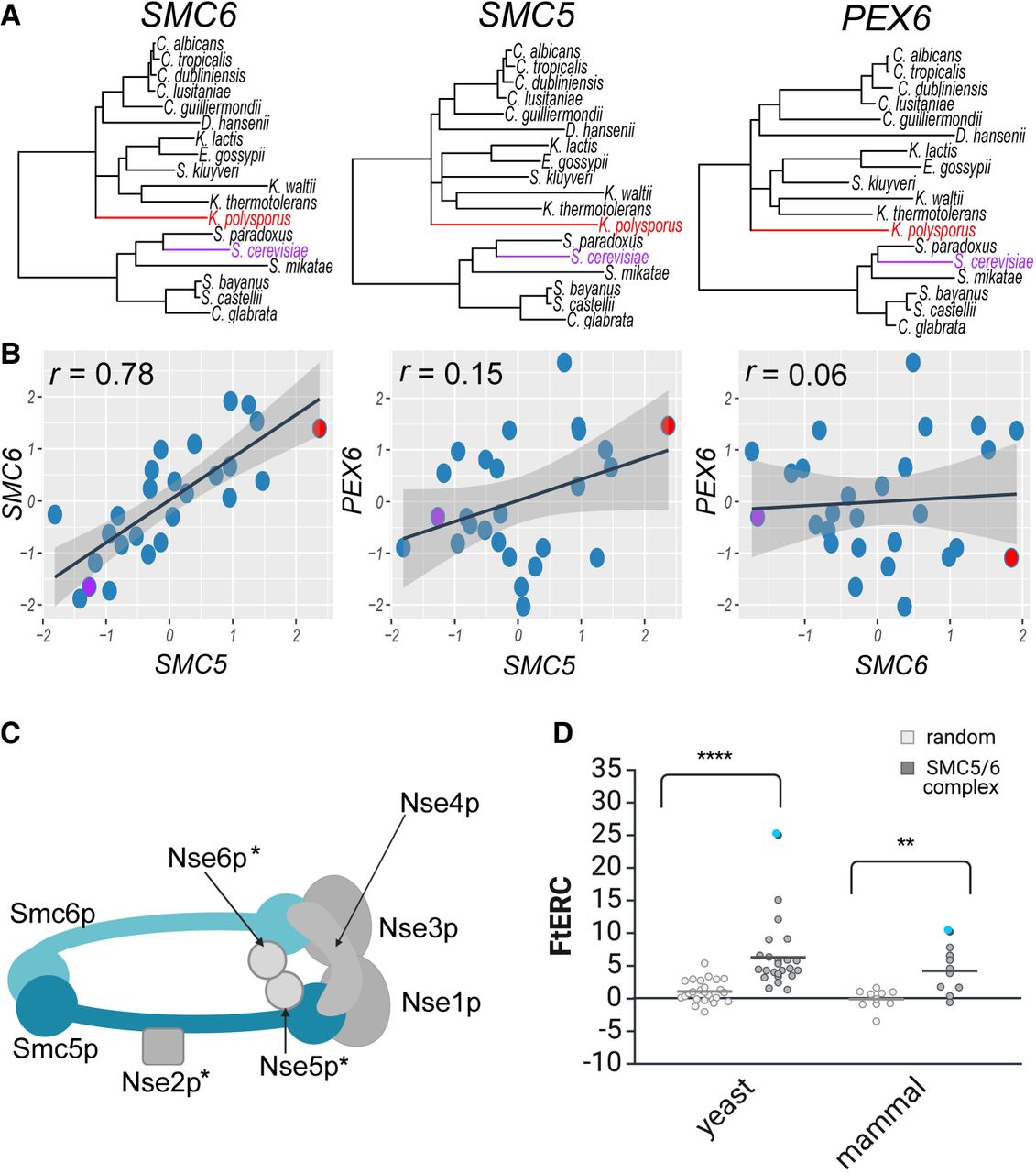 SMC5/6 complex shows significantly elevated ERC in both yeast and mammal phylogenies. (A) Gene trees showing the branch lengths for SMC6, SMC5, and PEX6, respectively, across 18 yeast species. Representative species, S. cerevisiae and K. polysporus, are highlighted in purple and red, respectively, in all three trees. (B) Scatter plots comparing the relative evolutionary rates for SMC6 × SMC5, SMC5 × PEX6, and SMC6 × PEX6 using the same 18 yeast species as shown in A with the representative species, S. cerevisiae and K. polysporus, shown in a purple and red dot, respectively. A linear regression line with 95% confidence interval is shown in black and gray, respectively. The Pearson's correlation for each comparison is shown in the top left corner of the plot. (C) Cartoon schematic of the SMC5/6 complex. An asterisk indicates a yeast-specific complex member. (D) Fisher-transformed ERC (FtERC) values for all pairs within the SMC5/6 complex for a yeast data set of 343 species (left; gray) and mammal data set of 120 species (right; gray) with size-matched random gene pair samples for each data set (white). The data point with the highest FtERC in both data sets is between SMC5 and SMC6 (blue dot). Both data sets had significantly higher ERC—(**) P < 0.001, (****) P < 0.00001—than the sample of randomly selected gene pairs from the entire genome. Panels C and D created in BioRender (Little et al. 2024; https://www.biorender.com).