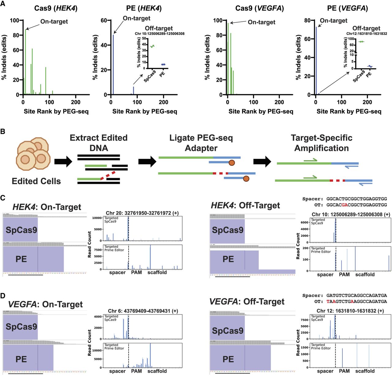 Analysis of PEG-seq identified off-targets in edited cells for SpCas9, and prime editor validates the ability of PEG-seq to identify editing sites in cells and shows RT extension at the on-target and infrequently at the identified off-target sites. (A) Hybrid capture analysis of SpCas9 and PE edited cells for the HEK4 (left) and VEGFA (right) pegRNAs. The top 250 sites identified by PEG-seq were analyzed, and the indel rate minus mock edited sample is shown averaged across two replicates. Each on-target is identified, and the prime editor off-target is shown in the inset plot (N = 2). (B) Overview of the targeted PEG-seq method used to analyze in cellulo generated DNA nicks and flaps at each corresponding on- and off-target site. (C,D) For each on- and off-target site, a representative IGV plot displays the mapped sequencing reads (purple blocks) and the read coverage at each position (gray bars) for prime editor and SpCas9 samples. (C,D) A PEG-seq signal plot is included with each IGV plot to display the count of reads that start at a given position. In all samples, the SpCas9 signal is apparent with a strong accumulation at the predicted nick site or 1–5 bp 5′ to that site (nick site is indicated by a broken line). A “scaffold” region is included to depict reads demonstrating RTT extension (seen as an accumulation of read start sites 3′ to the predicted nick location) that would not align to the reference sequence. The PE signal, including RTT extension, is apparent as the dominant signal at each on-target site (left) and is measurable, albeit at low frequency, in the off-target sites (right).