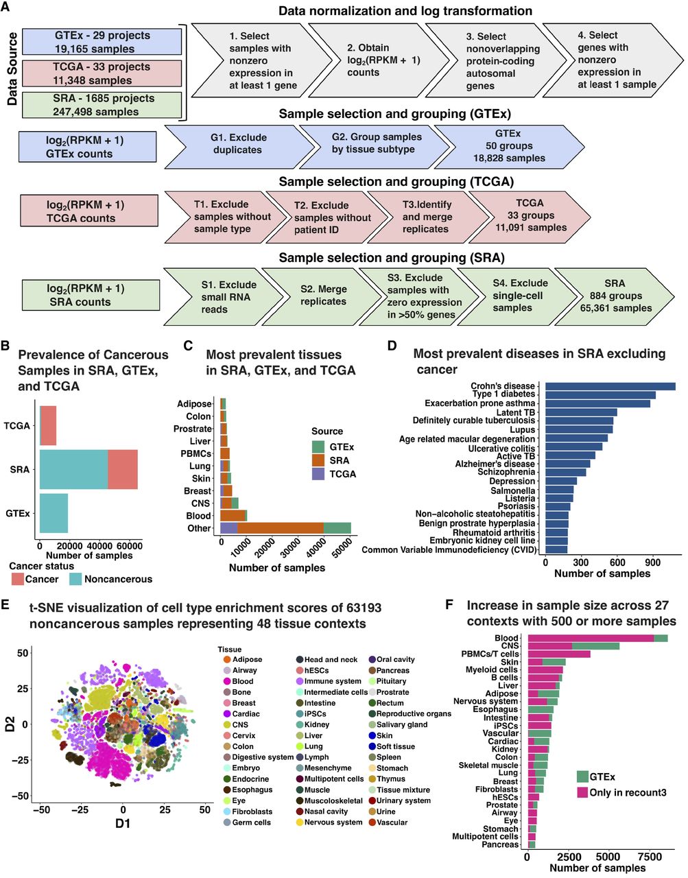 Overview of data preprocessing and annotations. (A) Gene expression data was RPKM normalized and log-transformed along with gene-specific and sample-specific filters. Based on the data source, normalized gene expression was processed to merge replicates and exclude miRNA and scRNA-seq samples. (B) Number of samples which were annotated to be noncancerous and cancerous based on available metadata across GTEx, SRA, and TCGA. Sixty-three SRA samples did not have an associated annotation corresponding to cancer status. (C) Top 10 tissue labels by sample size across all three data sources: SRA, GTEx, and TCGA. (D) Top 20 diseases by sample size found in SRA that are not cancer. (E) t-SNE projection of xCell deconvolution scores of 63,193 noncancerous samples colored by the tissue of origin. (F) Increase in the sample size of 27 tissue contexts by using SRA samples compared to GTEx only. SRA studies included seven novel contexts which were not available in GTEx.