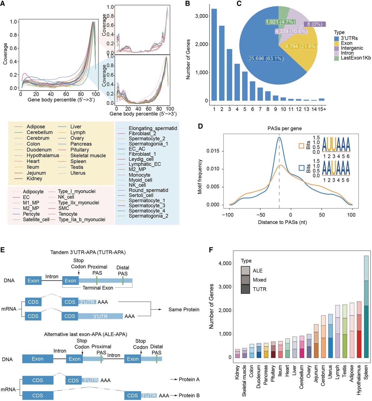 Identification of polyadenylation sites (PASs) using 10x snRNA-seq data. (A) Curve plot showing the coverage of each part of the gene body in 19 different tissues and in each cell type of two representative tissues (skeletal muscle tissue and testicular tissue). The plot on the left represents the percentage coverage of the genomes from 5′ to 3′ in different tissues, and the plot on the right is divided into two parts: the upper right part shows the gene body coverage of different cell types in skeletal muscle; and the lower right part shows the corresponding data in the testis. The x-axis is labeled with genome percentiles, and the y-axis is shown with coverage. (B) Distribution of the number of PASs per gene. (C) Genomic distribution of PASs. (D) Line plots illustrating the distribution of canonical PAS motifs (AAUAAA, AUUAAA), which are positioned from 90 nucleotides upstream to 90 nucleotides downstream of a random PAS selected on a transcript. (E) Two primary classes of 3′ mRNA isoforms generated by APA. (F) Distribution of three different classes of APA genes across 19 tissues.