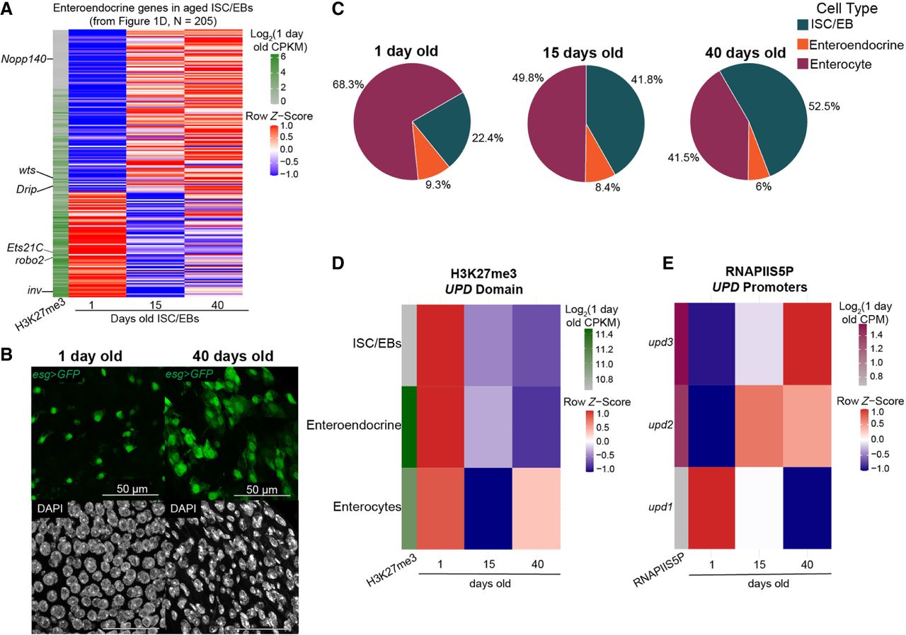 Stem cells display overproliferation and derepression of lineage-specifying genes and JAK/STAT ligands. (A) Row z-score-normalized heatmap of H3K27me3 counts of ISC/EBs for enteroendocrine genes defined in Figure 1D. The first column is the log2-transformed CPKM for 1-day-old tissue for each gene. (B) Immunofluorescence image of the gut in a young (1-day-old) and old (40-day-old) esgGal4/CyO; UAS-GFP/TM6B female. GFP (green) marks stem cells and EBs; gray, DAPI. (C) Pie charts of the proportion of each cell type per age. Significance was assessed by Monte Carlo permutation test (10,000 permutations). Observed enrichment was greater than expected by chance (P < 0.0001). (D) Row z-score-normalized heatmap of H3K27me3 counts over the unpaired domain, which encompasses three genes encoding JAK/STAT ligands. The first column is the log2-transformed counts for 1-day-old tissue for each promoter. ISC/EBs have the lowest H3K27me3 level of the three cell types in 1-day-old tissue and lose H3K27me3 signal with age, indicating derepression. Row z-scoring is used to present directionality of the change in signal with age. (E) Row z-score-normalized heatmap of RNAPIIS5P counts over promoters of the upd1, upd2, and upd3 genes. The first column is the log2-transformed counts for 1-day-old tissue for each promoter. upd2 and upd3 gain RNAPIIS5P signal in aged tissues, which is consistent with previous reports of these ligands. Row z-scoring is used to present directionality of the change in signal with age.