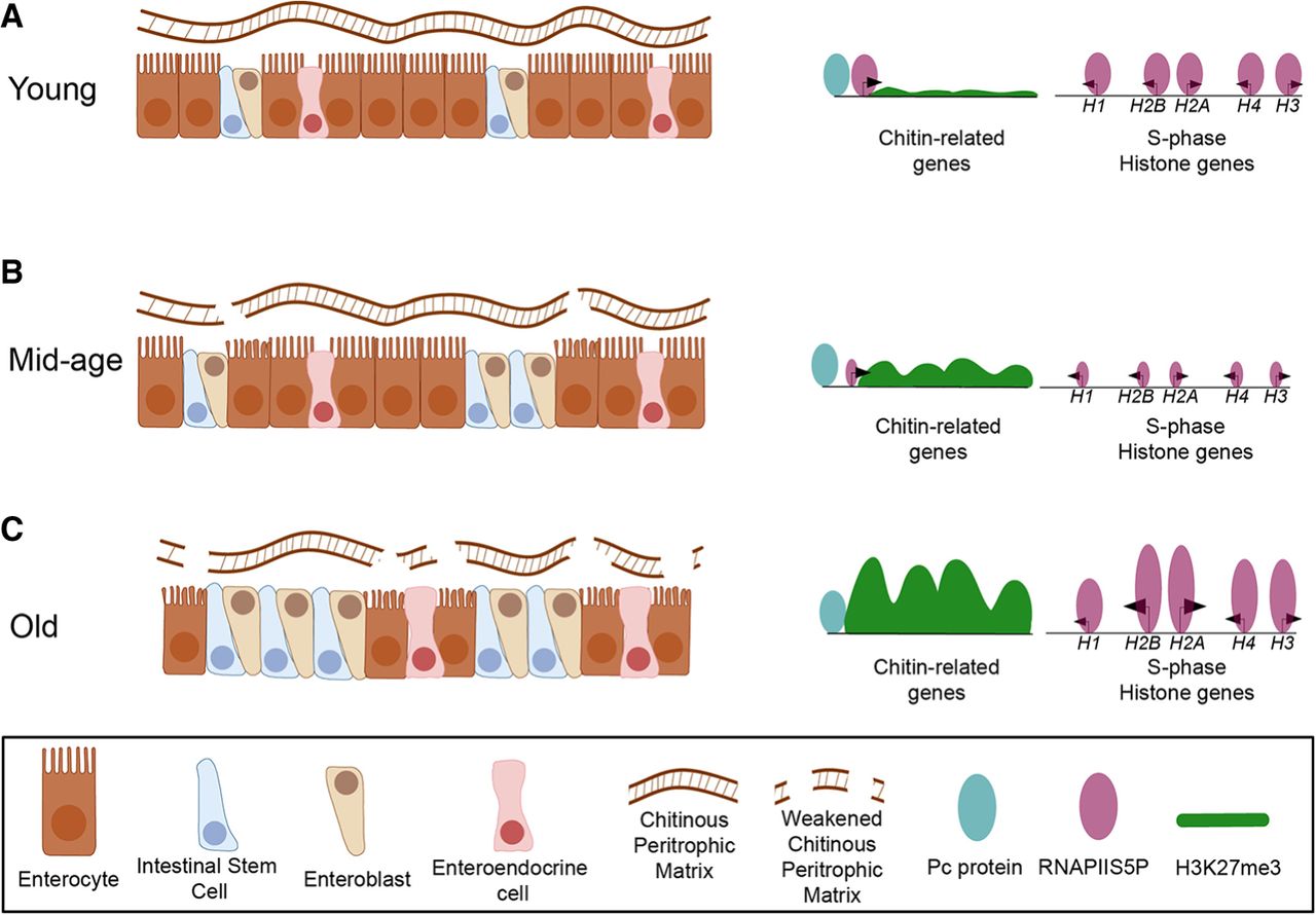 Model for cell type–specific Polycomb remodeling drives gut aging. (A) Young gut: The epithelium is composed primarily of enterocytes, with a small population of ISC/EBs. In enterocytes, Polycomb (Pc) binds chitin-related promoters (e.g., Chs2, Cht cluster), but H3K27me3 levels remain low, allowing robust RNAPII occupancy and continuous peritrophic-matrix production. Stem cells proliferate at homeostatic rates and show low RNAPII occupancy at S-phase histone loci. (B) Mid-age gut. Enterocyte numbers decline, and ISC/EBs expand. H3K27me3 signal accumulates at Pc-bound chitin genes in enterocytes, partially repressing chitin synthesis. The peritrophic matrix becomes thinned, causing moderate luminal stress and a slight increase in enterocyte turnover. Stem cells respond with increased proliferation but maintain low RNAPII at S-phase histone genes. (C) Old gut. Enterocytes are markedly depleted, and ISC/EBs predominate. In enterocytes, broad Pc-nucleated H3K27me3 domains entirely silence chitin-related loci, weakening the peritrophic matrix and exposing the epithelium to high luminal stress, further reducing enterocyte numbers. Barrier failure triggers stem cell hyperproliferation and massive RNAPII accumulation at S-phase histone loci, a histone hypertranscription signature resembling that of aggressive tumors.