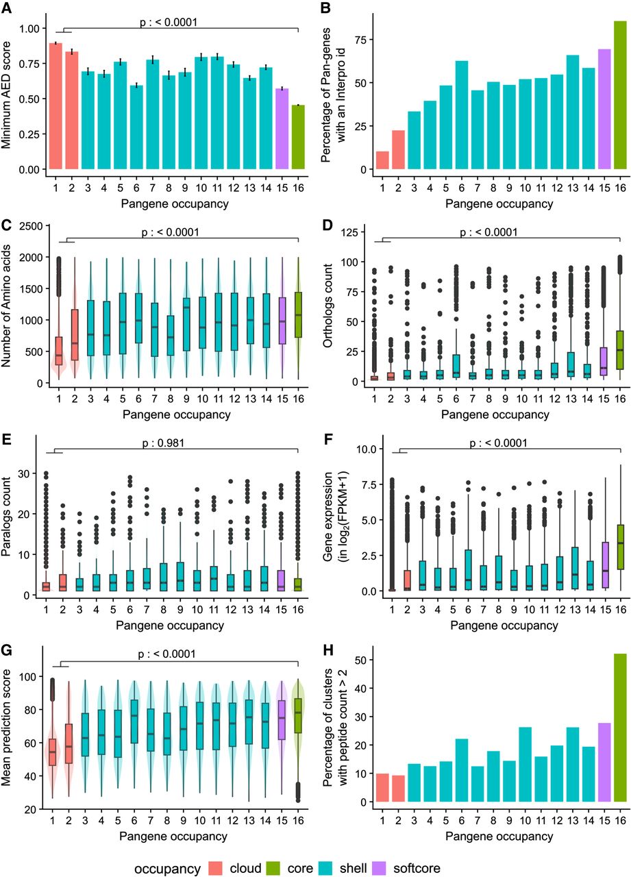 Exploration of pangenes and their properties by their occupancy. The x-axis shows the pangene occupancy for each cluster; the y-axis shows data derived from RAP-DB gene models within those clusters (clusters containing no RAP-DB model are excluded). (A) Mean of minimum AED score from three transcriptomic data sets. (B) Proportion of genes that contain a significant match to an InterPro domain. (C) Mean count of amino acids. (D) Boxplot showing the counts of orthologs derived from Ensembl Compara (see Methods). (E) Boxplot showing counts of paralogs. (F) Boxplot of mean quantitative gene expression data log2(FPKM + 1), sourced from 11,726 rice RNA-seq samples. (G) Boxplot of mean prediction score (pLDDT) from the corresponding AlphaFold2 model. (H) Percentage of clusters with genes having peptide evidence (n > 2 per gene). The p-value indicates result from Tukey's HSD test for core versus cloud pangenes.