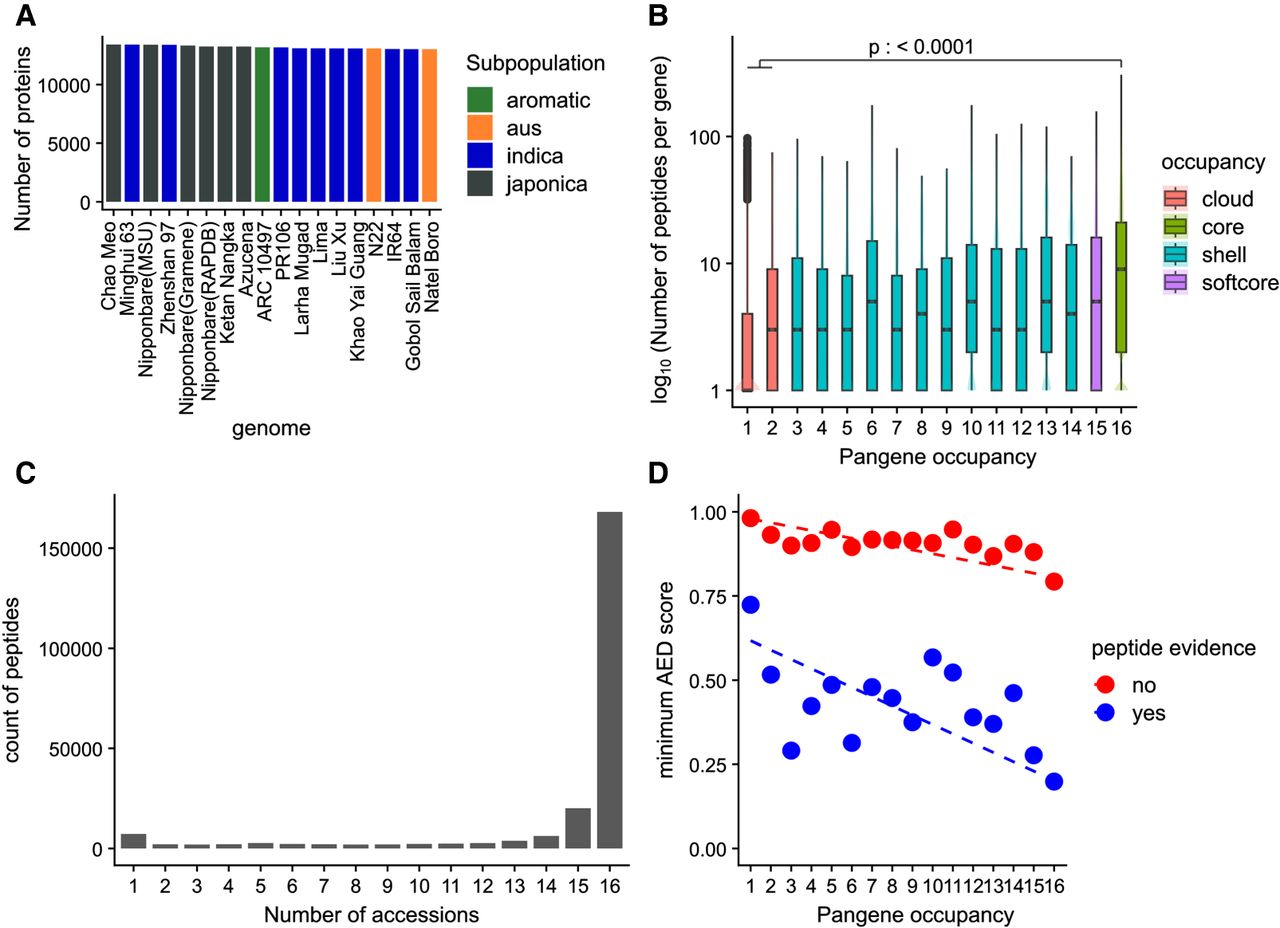 Experimental proteomics data support for pangenes. (A) Count of proteins per annotation set with at least two supporting peptides; (B) log counts of peptide sequences versus genome occupancy; (C) absolute counts of peptides mapped to proteins from one to 16 genomes; and (D) scatterplot of mean (min) AED score across three transcriptomics data sets for those (RAP-DB) gene products with or without peptide evidence, by genome occupancy of the pangenes. Dashed line indicates linear regression, indicating that gene products with peptide evidence have better (lower AED) support from transcriptomics data. The p-value indicates result from Tukey's HSD test for core versus cloud pangenes.