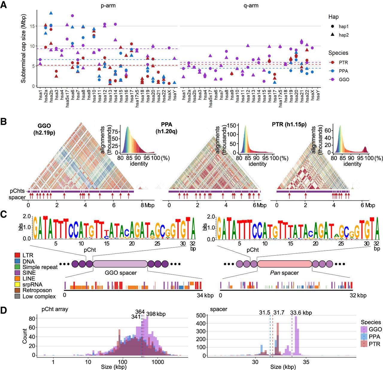 Overview of African great ape subterminal cap organization. (A) Size of p- or q-arm subterminal caps in three species: chimpanzee (PTR), bonobo (PPA), and gorilla (GGO), indicated by red, blue, and purple, respectively. Circles and triangles indicate haplotypes 1 and 2, or maternal and paternal for bonobo and gorilla, respectively. (B) StainedGlass (Vollger et al. 2022) self-alignment plot of subterminal caps including pCht satellites indicated by the purple track below the triangular heatmap, as well as subterminal SD spacers interrupting satellite arrays, indicated by the red arrows below. (C) The structure of subterminal caps. From the top, the logo base profile of pCht satellite is shown, followed by the higher-order structure of subterminal cap sequences, and the sequence composition of the subterminal SDs at the bottom. (D) Size distribution of uninterrupted pCht array and subterminal SDs. The dotted line indicates the mean. The x-axis is in a log10 scale for the pCht array owing to variation in its size.