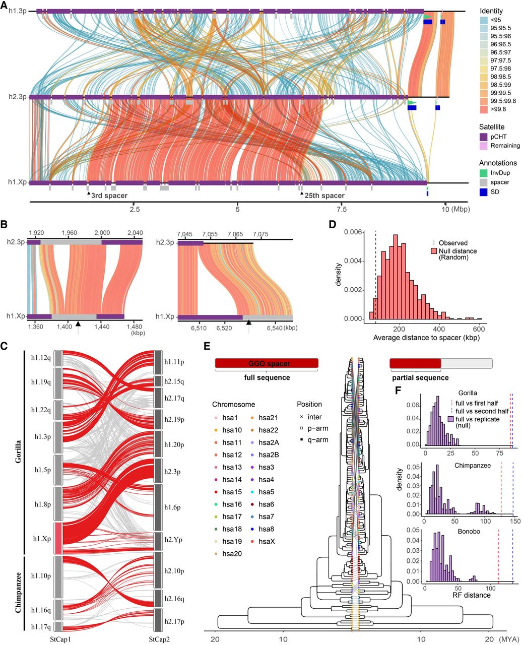 Evidence of nonallelic sequence exchange at SD spacers. (A) An alignment view (SVbyEye) (Porubsky et al. 2024) depicting a candidate ectopic exchange between subterminal satellite chromosomes hsa3 and hsaX p-arms of gorilla. The percentage identity of alignment (scaled from blue <95% to red >99.8%) with annotation tracks for higher-order pCht blocks, satellites, and SDs is shown on the right. (B) Enlarged view of the two exchange breakpoints (black arrows) mapping within the third and 25th SD spacers. (C) Overview of potential ectopic exchange events between the subterminal caps (left-StCap1 vs. right-StCap2 tracks) identified in African great ape genomes (eight and three events in gorilla and chimpanzee, respectively, including hsa3p vs. hsaXp in red). Assembly quality at the breakpoints was validated by a read-depth analysis in Supplemental Figures S20–S26. (D) Simulation test of exchange event breakpoints, suggesting that the exchange breaks (>99.8% identity alignment blocks; dotted line) are more likely to be located within or close to subterminal SD spacers compared with a random distribution (red histogram). (E,F) Comparison of maximum likelihood phylogeny to test recombination of SD spacer. A phylogenetic tree of the complete spacer sequence (left) is compared with that of a subset of the sequence (right). The tip nodes of the left tree are linked to the corresponding nodes of the right tree to visualize phylogenetic shifts in the topology. Robinson–Foulds (RF) distance is used to measure the extent of phylogenetic shift (first or last half sequences, in red and blue dotted lines, compared to a null distribution generated by computing distances of consensus tree vs. bootstrap replicate trees).