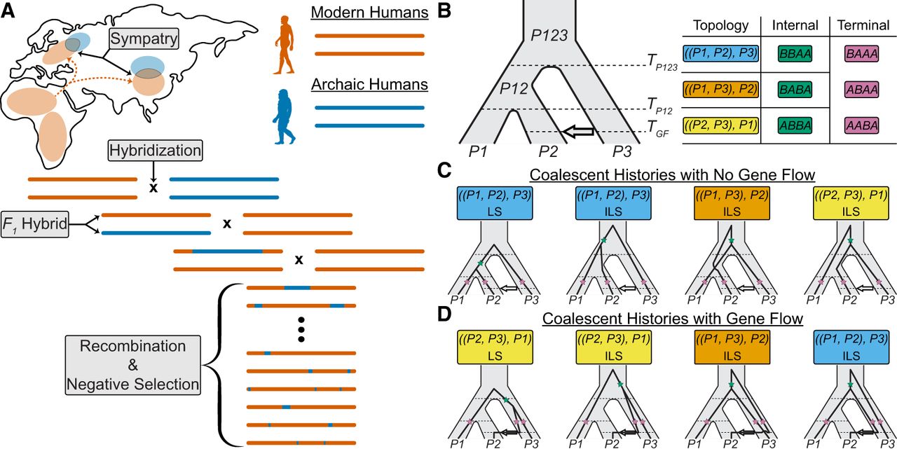 The genomic and genealogical signals of introgression. (A) Schematic of the introgression process, where some modern human populations (vermilion) migrated out of Africa, came into contact with archaic humans (blue) in Eurasia followed by subsequent interbreeding events. Over many generations, archaic segments are broken down due to recombination, purged due to negative selection, and incorporated into the genomes of present-day modern humans. (B) Instantaneous Unidirectional Admixture (IUA) model for studying introgression from a donor population (P3) into a hypothesized recipient population (P2) where P1 represents a control population assumed to have no genetic contributions from P3. In this model, the ancestral relationships are traced for a single lineage per population resulting in eight unique coalescent histories with only three possible topologies, that is, branching orders among lineages. Coalescent histories where P1 and P2 coalesce first, P1 and P3 coalesce first, and P2 and P3 coalesce first are depicted in sky blue, orange, and yellow; respectively. Under the IUA model, a site pattern is defined by the configuration of ancestral (A) and derived alleles (B) at a given site for the ordered set {P1, P2, P3, O}, where O represents an outgroup population used to polarized ancestral states in practice. Each topology will result in one unique site pattern resulting from a mutation occurring on the internal branch (green stars), while all topologies can generate three additional site patterns resulting from a mutation occurring on one of the three terminal branches (pink stars). (C) In the absence of gene flow, there are four unique coalescent histories under the IUA model, one with a history of lineage sorting (LS) between P1 and P2, and three equally probable histories of incomplete lineage sorting (ILS). (D) In the presence of gene flow, there are four additional coalescent histories, where the P2 lineage traces its ancestry through P3’s side of the tree, one with a history of LS between P2 and P3, and three equally probable histories of ILS.